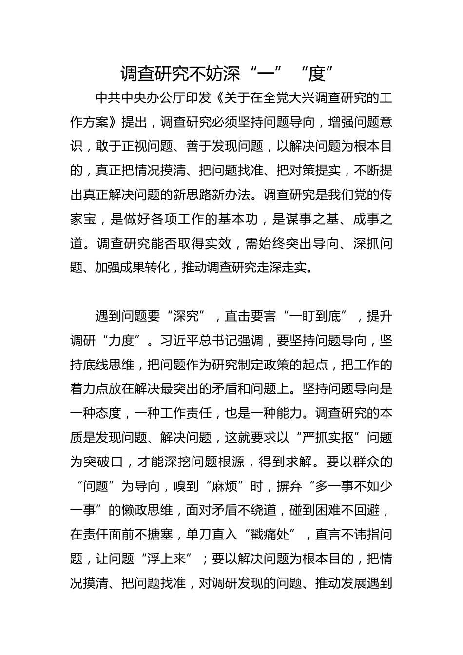 調(diào)查研究不妨深“一”“度”中共中央辦公廳印發(fā)《關于在全黨大興調(diào)查研究的工作方案》提出,調(diào)查研究必須堅持問題導向,增強問題意識,敢于正視問題、善于發(fā)現(xiàn)問題,以解決問題為根本目的,真正把情況摸清、把問題找準、把對策提實,不斷提出真正解決問題的新思路新辦法。調(diào)查研究是我們黨的傳家寶,是做好各項工作的基本功,是謀事之基、成事之道。調(diào)查研究能否取得實效,需始終突出導向、深抓問題、加強成果轉(zhuǎn)化,推動調(diào)查研究走深走實。遇到問題要“深究”,直擊要害“一盯到底”,提升調(diào)研“力度”。習近平總書記強調(diào),要堅持問題導向,堅持底線思維,把問題作為研究...