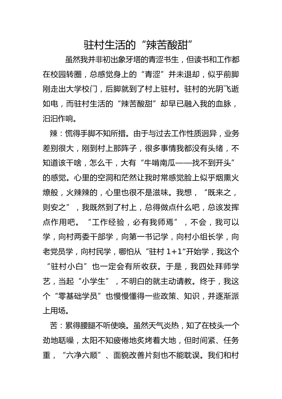 駐村生活的“辣苦酸甜”雖然我并非初出象牙塔的青澀書生,但讀書和工作都在校園轉(zhuǎn)圈,總感覺身上的“青澀”并未退卻,似乎前腳剛走出大學(xué)校門,后腳就到了村上駐村。駐村的光陰飛逝如電,而駐村生活的“辣苦酸甜”卻早已融入我的血脈,汩汩作響。辣:慌得手腳不知所措。由于與過去工作性質(zhì)迥異,業(yè)務(wù)差別很大,剛到村上那陣子,很多事情我都沒有頭緒,不知道該干啥,怎么干,大有“??心瞎稀也坏介_頭”的感覺。心里的空洞和茫然讓我時常感覺臉上似乎煙熏火燎般,火辣辣的,心里也很不是滋味。我想,“既來之,則安之”,我既然到了村上,總得做點什么吧,總該發(fā)揮點...