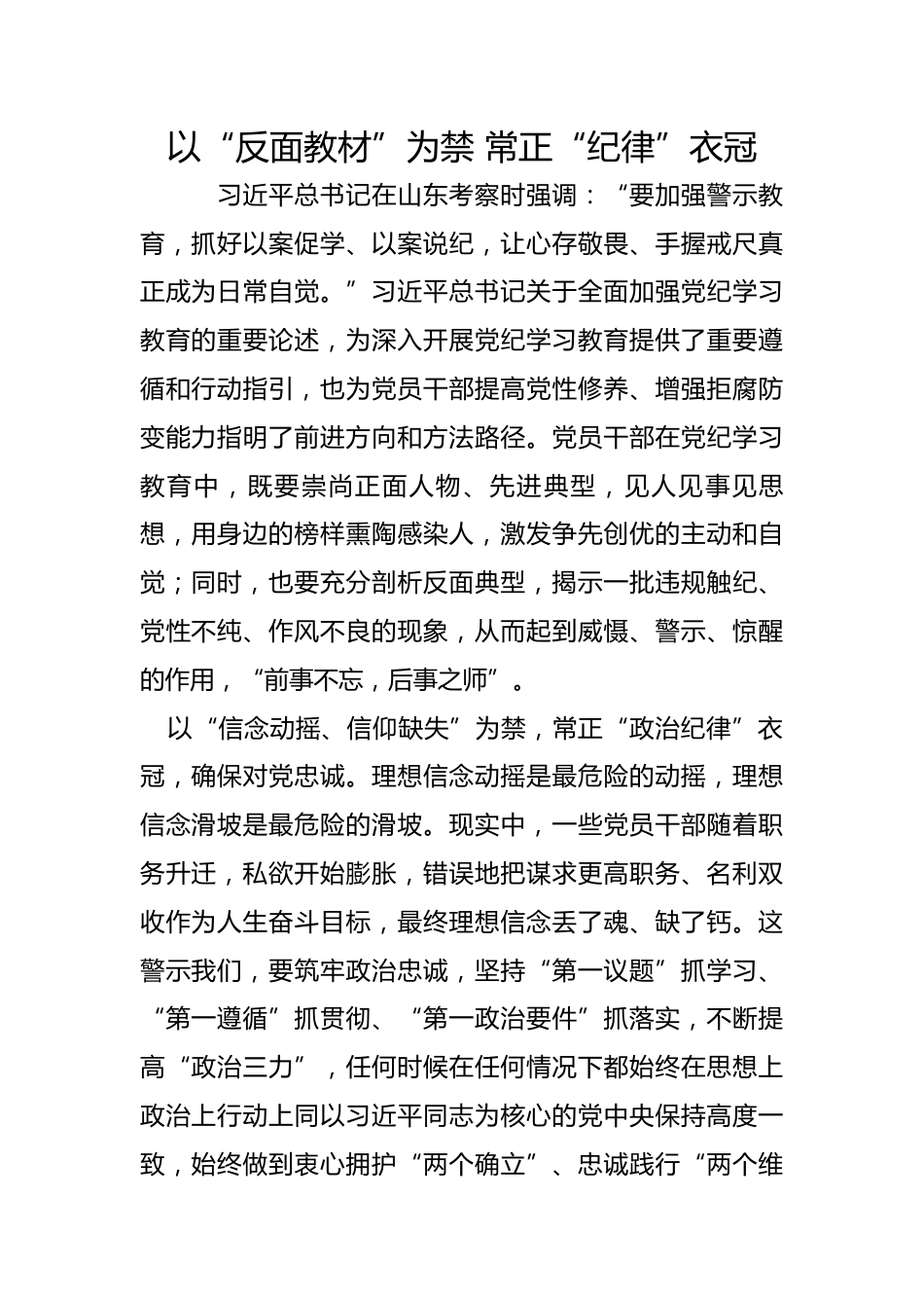 以“反面教材”為禁常正“紀(jì)律”衣冠習(xí)近平總書(shū)記在山東考察時(shí)強(qiáng)調(diào):“要加強(qiáng)警示教育,抓好以案促學(xué)、以案說(shuō)紀(jì),讓心存敬畏、手握戒尺真正成為日常自覺(jué)?!绷?xí)近平總書(shū)記關(guān)于全面加強(qiáng)黨紀(jì)學(xué)習(xí)教育的重要論述,為深入開(kāi)展黨紀(jì)學(xué)習(xí)教育提供了重要遵循和行動(dòng)指引,也為黨員干部提高黨性修養(yǎng)、增強(qiáng)拒腐防變能力指明了前進(jìn)方向和方法路徑。黨員干部在黨紀(jì)學(xué)習(xí)教育中,既要崇尚正面人物、先進(jìn)典型,見(jiàn)人見(jiàn)事見(jiàn)思想,用身邊的榜樣熏陶感染人,激發(fā)爭(zhēng)先創(chuàng)優(yōu)的主動(dòng)和自覺(jué);同時(shí),也要充分剖析反面典型,揭示一批違規(guī)觸紀(jì)、黨性不純、作風(fēng)不良的現(xiàn)象,從而起到威懾、警示、驚醒的作...