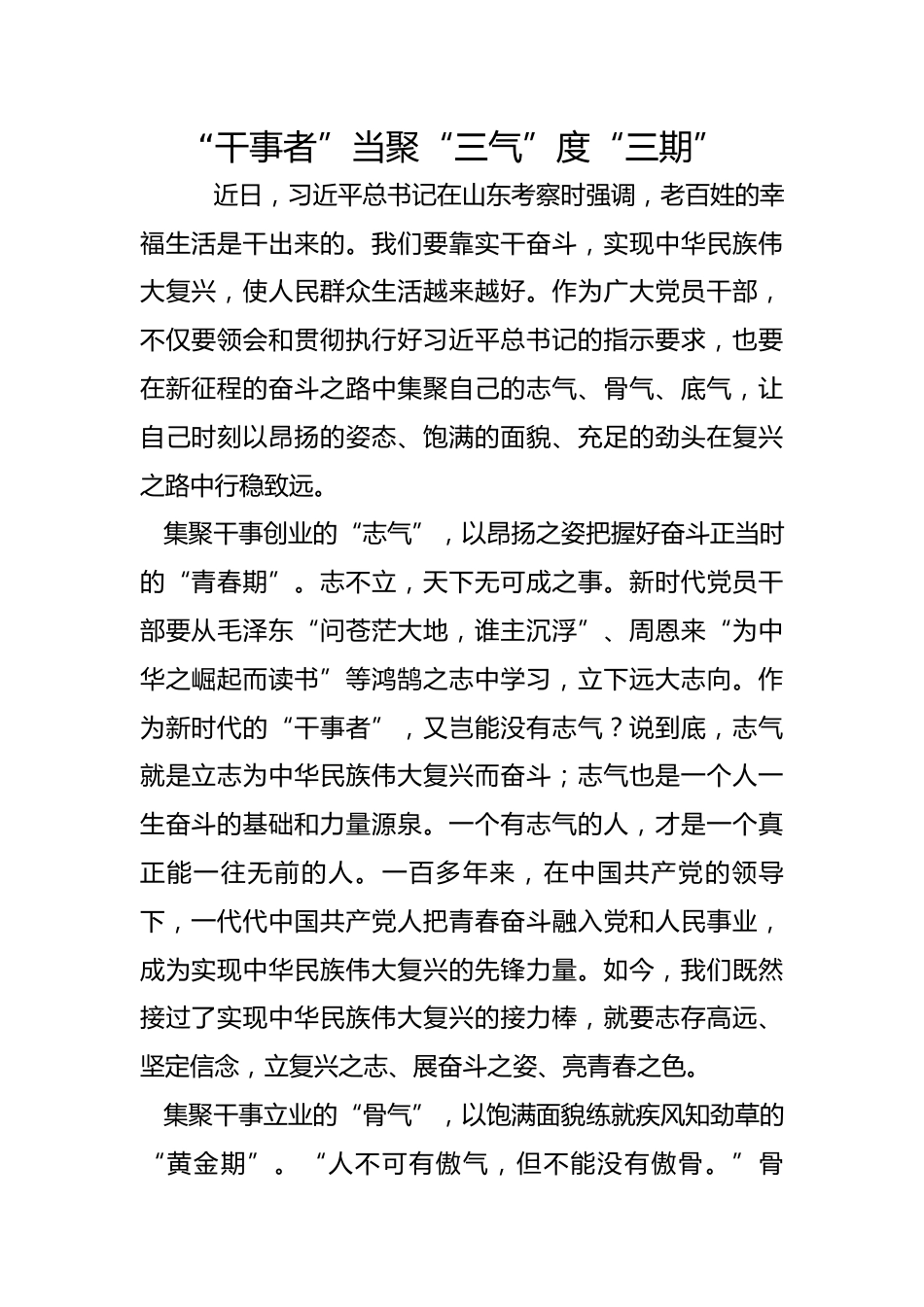 “干事者”當聚“三氣”度“三期”近日,習近平總書記在山東考察時強調(diào),老百姓的幸福生活是干出來的。我們要靠實干奮斗,實現(xiàn)中華民族偉大復興,使人民群眾生活越來越好。作為廣大黨員干部,不僅要領(lǐng)會和貫徹執(zhí)行好習近平總書記的指示要求,也要在新征程的奮斗之路中集聚自己的志氣、骨氣、底氣,讓自己時刻以昂揚的姿態(tài)、飽滿的面貌、充足的勁頭在復興之路中行穩(wěn)致遠。集聚干事創(chuàng)業(yè)的“志氣”,以昂揚之姿把握好奮斗正當時的“青春期”。志不立,天下無可成之事。新時代黨員干部要從毛澤東“問蒼茫大地,誰主沉浮”、周恩來“為中華之崛起而讀書”等鴻鵠之志中學習,立...