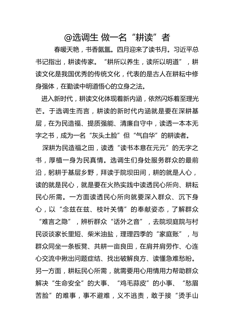 @選調(diào)生做一名“耕讀”者春暖天艷,書香氤氳。四月迎來了讀書月。習(xí)近平總書記指出,耕讀傳家?!案责B(yǎng)生,讀所以明道”,耕讀文化是我國優(yōu)秀的傳統(tǒng)文化,代表的是古人在耕耘中修身強(qiáng)體,在勤讀中明道悟心的立身之法。進(jìn)入新時代,耕讀文化體現(xiàn)著新內(nèi)涵,依然閃爍著至理光芒。于選調(diào)生而言,耕讀的新時代內(nèi)涵就是要在深耕基層,在為民造福、提質(zhì)強(qiáng)能、清廉自守中,讀透一本本無字之書,成為一名“灰頭土臉”但“氣自華”的耕讀者。深耕為民造福之田,讀透“讀書本意在元元”的無字之書,厚植一身為民真情。選調(diào)生們身處服務(wù)群眾的最前沿,躬耕于基層鄉(xiāng)野,拜讀于院壩...
