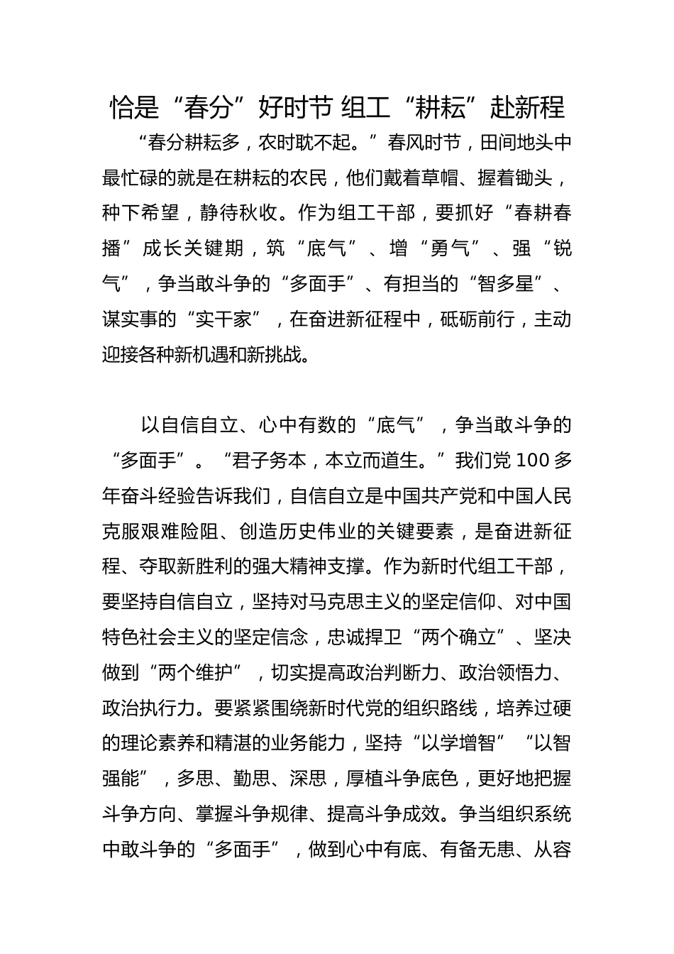 恰是“春分”好時節(jié)組工“耕耘”赴新程“春分耕耘多,農(nóng)時耽不起?!贝猴L(fēng)時節(jié),田間地頭中最忙碌的就是在耕耘的農(nóng)民,他們戴著草帽、握著鋤頭,種下希望,靜待秋收。作為組工干部,要抓好“春耕春播”成長關(guān)鍵期,筑“底氣”、增“勇氣”、強(qiáng)“銳氣”,爭當(dāng)敢斗爭的“多面手”、有擔(dān)當(dāng)?shù)摹爸嵌嘈恰薄⒅\實事的“實干家”,在奮進(jìn)新征程中,砥礪前行,主動迎接各種新機(jī)遇和新挑戰(zhàn)。以自信自立、心中有數(shù)的“底氣”,爭當(dāng)敢斗爭的“多面手”?!熬觿?wù)本,本立而道生?!蔽覀凕h100多年奮斗經(jīng)驗告訴我們,自信自立是中國共產(chǎn)黨和中國人民克服艱難險阻、創(chuàng)造歷史偉業(yè)的關(guān)鍵要...
