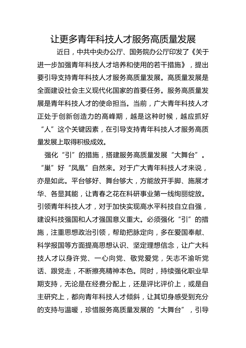 讓更多青年科技人才服務高質量發(fā)展近日,中共中央辦公廳、國務院辦公廳印發(fā)了《關于進一步加強青年科技人才培養(yǎng)和使用的若干措施》,提出要引導支持青年科技人才服務高質量發(fā)展。高質量發(fā)展是全面建設社會主義現代化國家的首要任務。服務高質量發(fā)展是青年科技人才的使命擔當。當前,廣大青年科技人才正處于創(chuàng)新創(chuàng)造力的高峰期,越是這種時候,越應抓好“人”這個關鍵因素,在引導支持青年科技人才服務高質量發(fā)展上取得積極成效。強化“引”的措施,搭建服務高質量發(fā)展“大舞臺”?!俺病焙谩傍P凰”自然來。對于廣大青年科技人才來說,亦是如此。平臺夠好、舞臺夠大,方能...