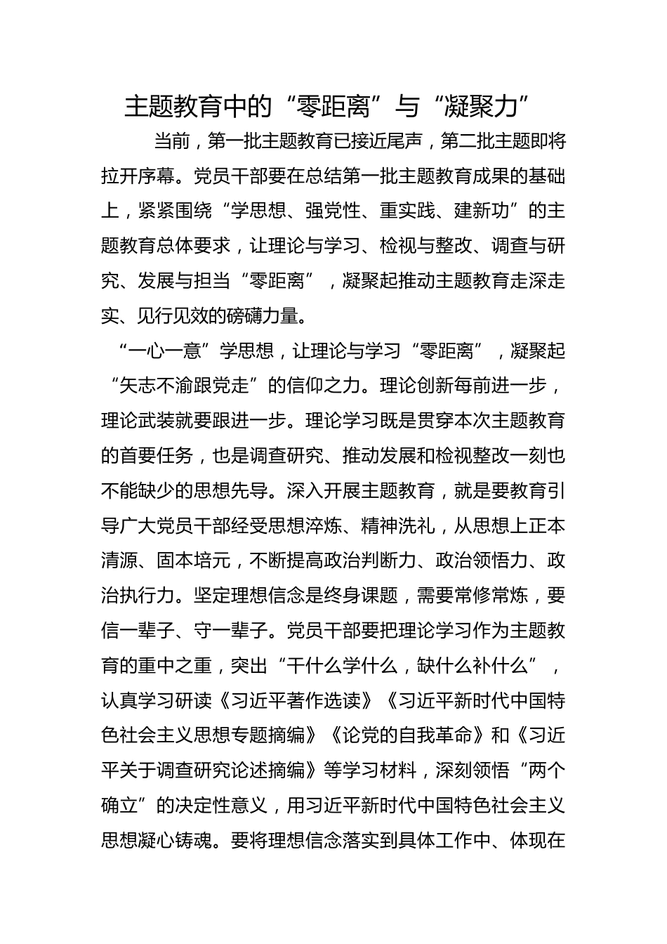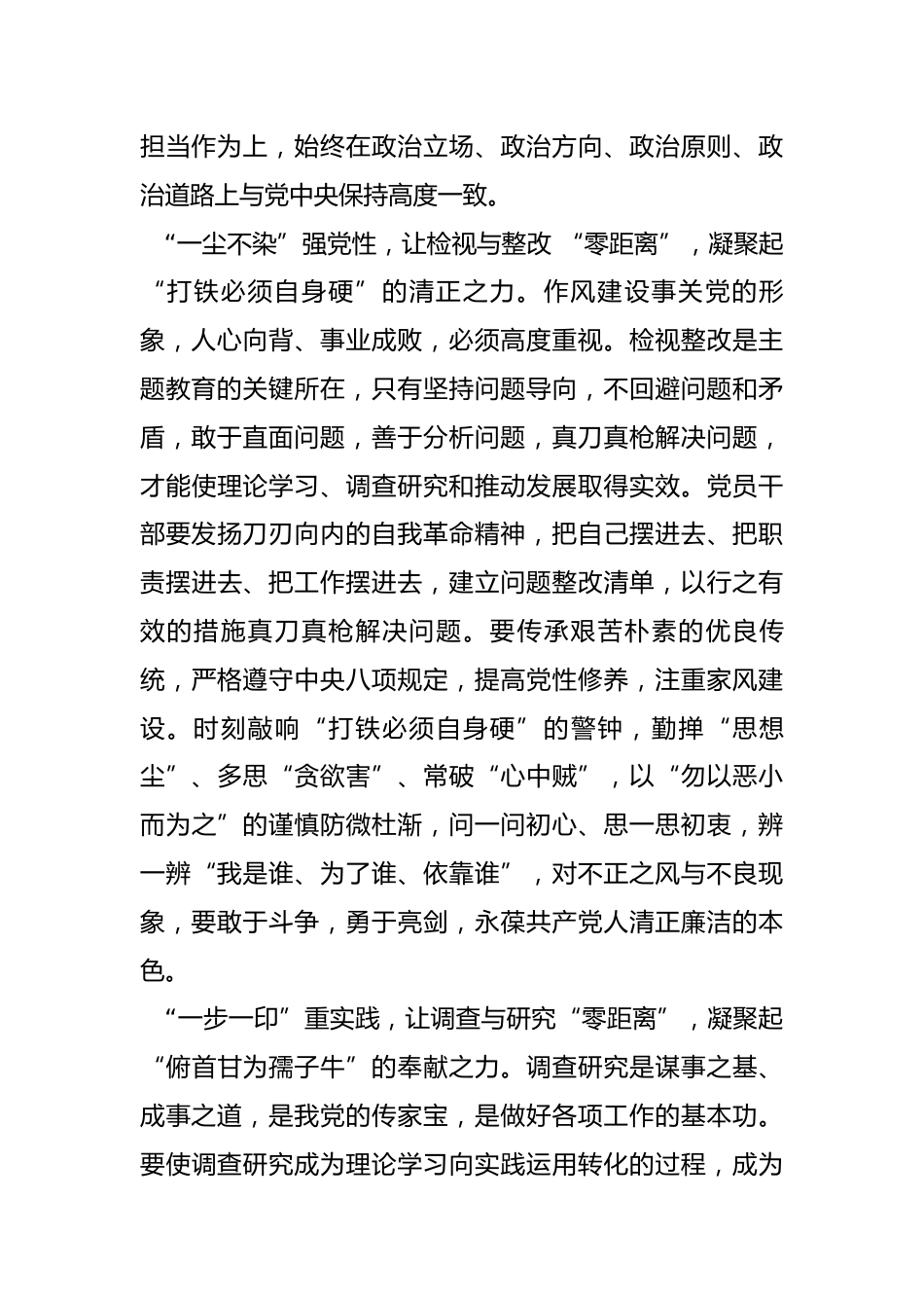 主題教育中的“零距離”與“凝聚力”當前,第一批主題教育已接近尾聲,第二批主題即將拉開序幕。黨員干部要在總結(jié)第一批主題教育成果的基礎(chǔ)上,緊緊圍繞“學思想、強黨性、重實踐、建新功”的主題教育總體要求,讓理論與學習、檢視與整改、調(diào)查與研究、發(fā)展與擔當“零距離”,凝聚起推動主題教育走深走實、見行見效的磅礴力量?!耙恍囊灰狻睂W思想,讓理論與學習“零距離”,凝聚起“矢志不渝跟黨走”的信仰之力。理論創(chuàng)新每前進一步,理論武裝就要跟進一步。理論學習既是貫穿本次主題教育的首要任務,也是調(diào)查研究、推動發(fā)展和檢視整改一刻也不能缺少的思想先導。深入開...