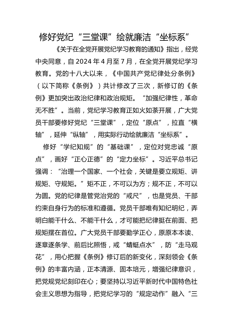 修好黨紀(jì)“三堂課”繪就廉潔“坐標(biāo)系”《關(guān)于在全黨開展黨紀(jì)學(xué)習(xí)教育的通知》指出,經(jīng)黨中央同意,自2024年4月至7月,在全黨開展黨紀(jì)學(xué)習(xí)教育。黨的十八大以來,《中國共產(chǎn)黨紀(jì)律處分條例》(以下簡稱《條例》)共計(jì)修改了三次,新修訂的《條例》更加突出政治紀(jì)律和政治規(guī)矩?!凹訌?qiáng)紀(jì)律性,革命無不勝”。當(dāng)前,黨紀(jì)學(xué)習(xí)教育正如火如荼開展,廣大黨員干部要修好黨紀(jì)“三堂課”,定位“原點(diǎn)”,拉直“橫軸”,延伸“縱軸”,用實(shí)際行動繪就廉潔“坐標(biāo)系”。修好“學(xué)紀(jì)知規(guī)”的“基礎(chǔ)課”,定位對黨忠誠“原點(diǎn)”,畫好“正心正德”的“定力坐標(biāo)”。習(xí)近平總書記強(qiáng)調(diào):“治...