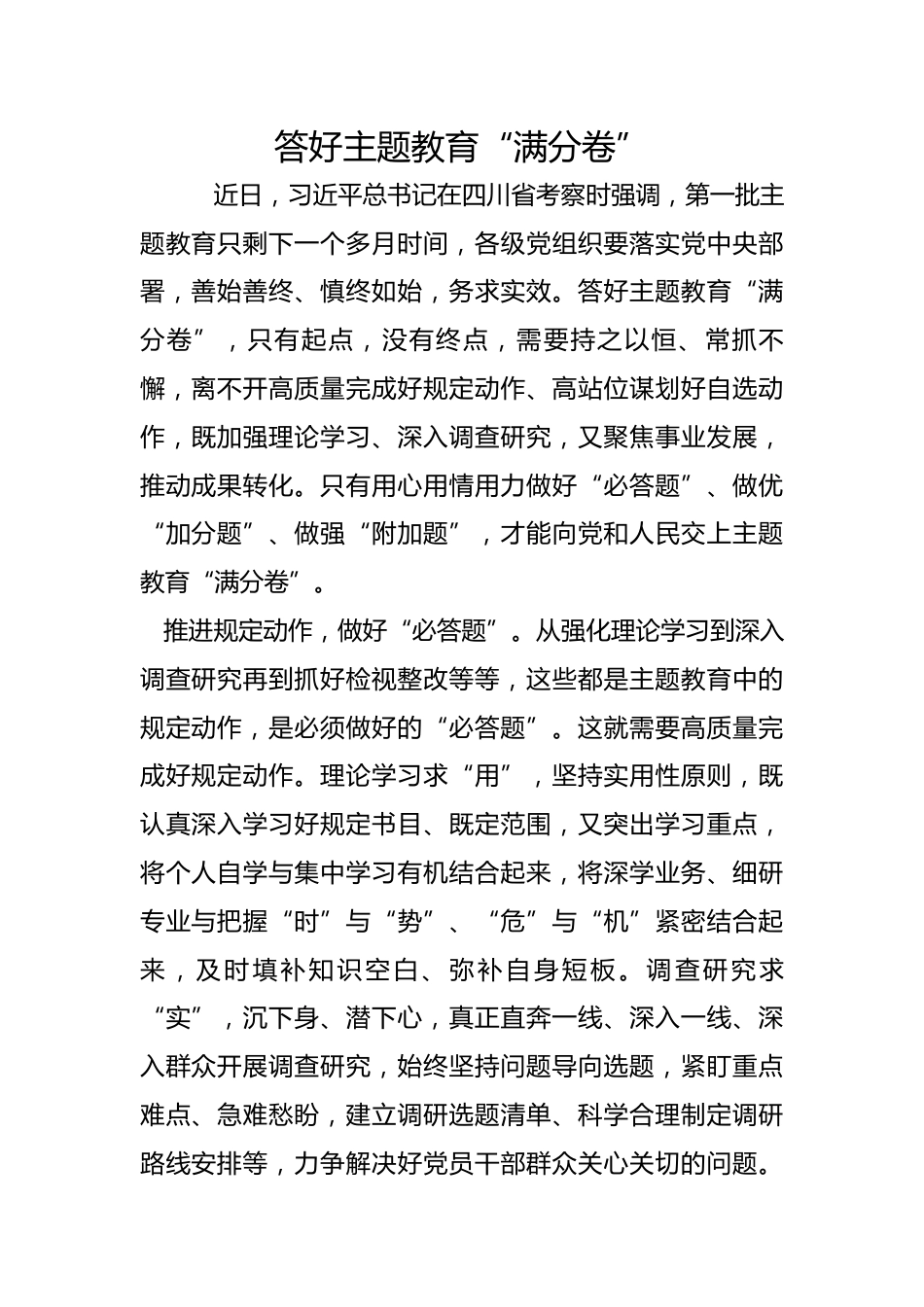 答好主題教育“滿分卷”近日,習(xí)近平總書記在四川省考察時強(qiáng)調(diào),第一批主題教育只剩下一個多月時間,各級黨組織要落實(shí)黨中央部署,善始善終、慎終如始,務(wù)求實(shí)效。答好主題教育“滿分卷”,只有起點(diǎn),沒有終點(diǎn),需要持之以恒、常抓不懈,離不開高質(zhì)量完成好規(guī)定動作、高站位謀劃好自選動作,既加強(qiáng)理論學(xué)習(xí)、深入調(diào)查研究,又聚焦事業(yè)發(fā)展,推動成果轉(zhuǎn)化。只有用心用情用力做好“必答題”、做優(yōu)“加分題”、做強(qiáng)“附加題”,才能向黨和人民交上主題教育“滿分卷”。推進(jìn)規(guī)定動作,做好“必答題”。從強(qiáng)化理論學(xué)習(xí)到深入調(diào)查研究再到抓好檢視整改等等,這些都是主題教育中...