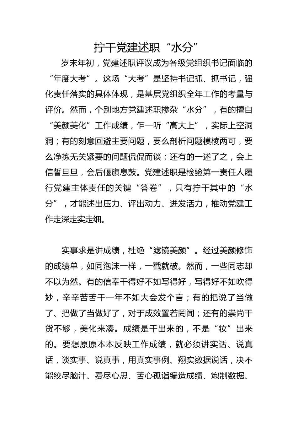 擰干黨建述職“水分”歲末年初,黨建述職評議成為各級黨組織書記面臨的“年度大考”。這場“大考”是堅(jiān)持書記抓、抓書記,強(qiáng)化責(zé)任落實(shí)的具體體現(xiàn),是基層黨組織全年工作的考量與評價(jià)。然而,個(gè)別地方黨建述職摻雜“水分”,有的擅自“美顏美化”工作成績,乍一聽“高大上”,實(shí)際上空洞洞;有的刻意回避主要問題,要么剖析問題模棱兩可,要么凈揀無關(guān)緊要的問題侃侃而談;還有的一述了之,會(huì)上信誓旦旦,會(huì)后偃旗息鼓。黨建述職是檢驗(yàn)第一責(zé)任人履行黨建主體責(zé)任的關(guān)鍵“答卷”,只有擰干其中的“水分”,才能述出壓力、評出動(dòng)力、迸發(fā)活力,推動(dòng)黨建工作走深走實(shí)走細(xì)。...