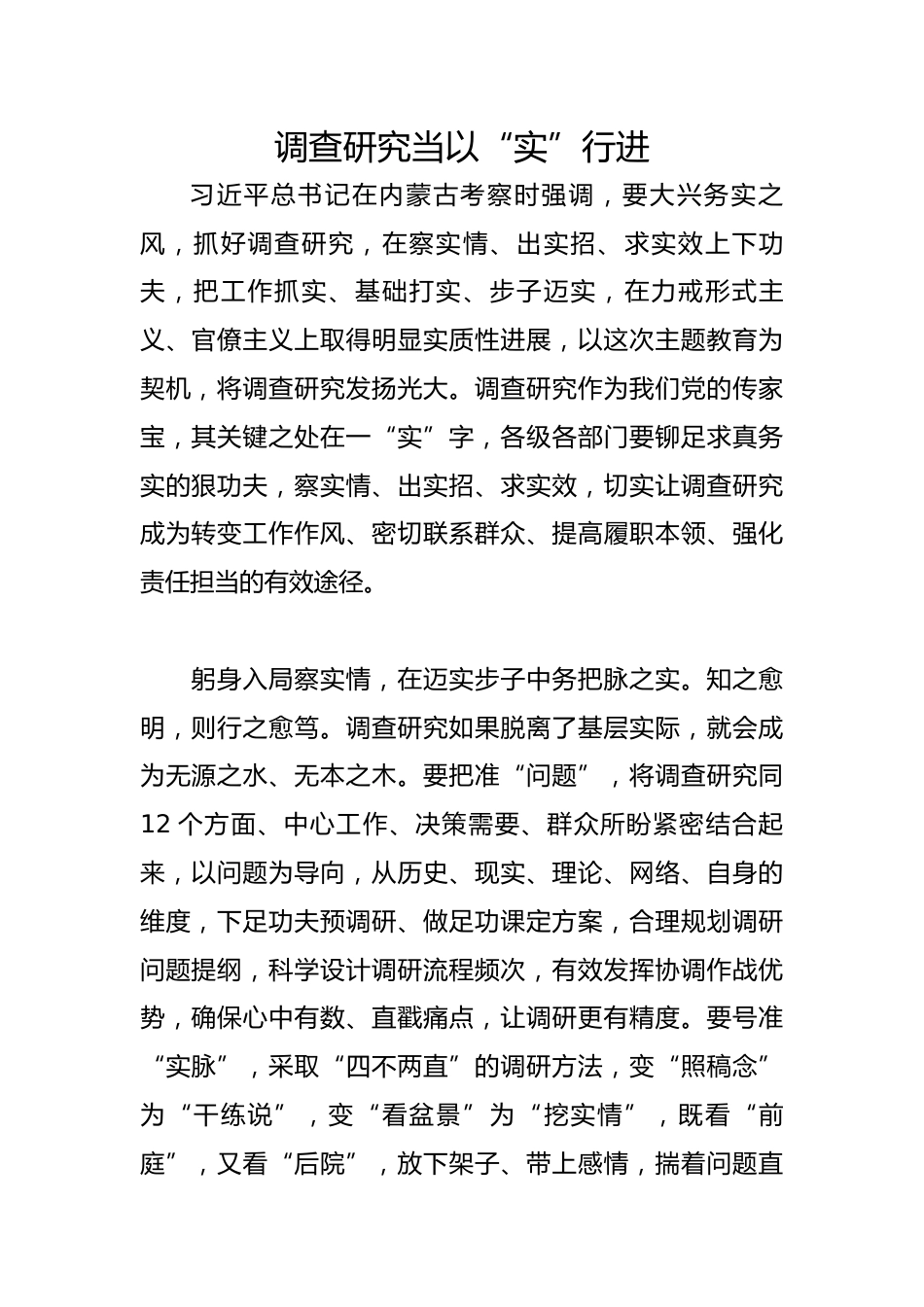 調(diào)查研究當(dāng)以“實(shí)”行進(jìn)習(xí)近平總書記在內(nèi)蒙古考察時(shí)強(qiáng)調(diào),要大興務(wù)實(shí)之風(fēng),抓好調(diào)查研究,在察實(shí)情、出實(shí)招、求實(shí)效上下功夫,把工作抓實(shí)、基礎(chǔ)打?qū)?、步子邁實(shí),在力戒形式主義、官僚主義上取得明顯實(shí)質(zhì)性進(jìn)展,以這次主題教育為契機(jī),將調(diào)查研究發(fā)揚(yáng)光大。調(diào)查研究作為我們黨的傳家寶,其關(guān)鍵之處在一“實(shí)”字,各級(jí)各部門要鉚足求真務(wù)實(shí)的狠功夫,察實(shí)情、出實(shí)招、求實(shí)效,切實(shí)讓調(diào)查研究成為轉(zhuǎn)變工作作風(fēng)、密切聯(lián)系群眾、提高履職本領(lǐng)、強(qiáng)化責(zé)任擔(dān)當(dāng)?shù)挠行緩?。躬身入局察?shí)情,在邁實(shí)步子中務(wù)把脈之實(shí)。知之愈明,則行之愈篤。調(diào)查研究如果脫離了基層實(shí)際,就會(huì)成為...