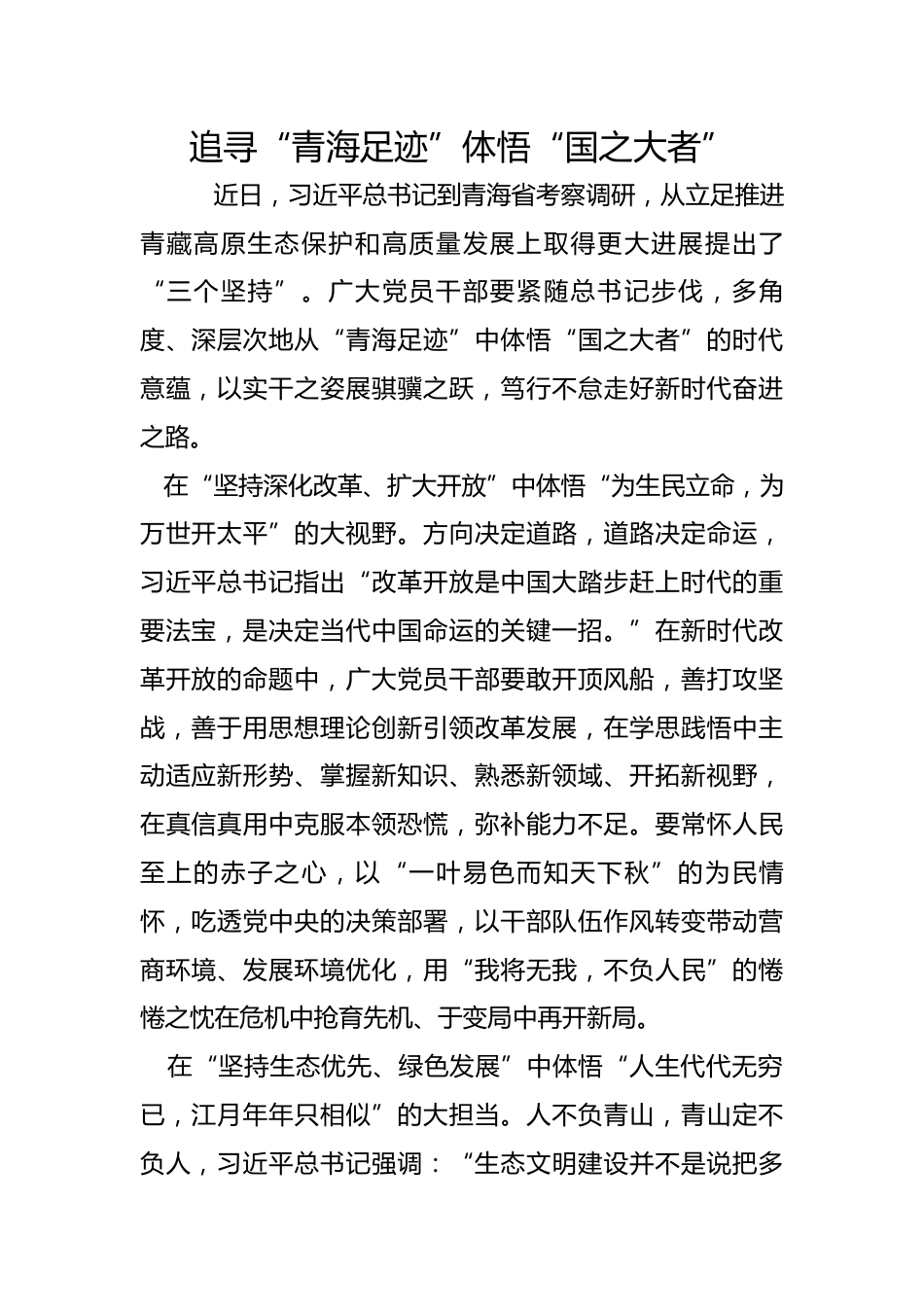 追尋“青海足跡”體悟“國(guó)之大者”近日,習(xí)近平總書記到青海省考察調(diào)研,從立足推進(jìn)青藏高原生態(tài)保護(hù)和高質(zhì)量發(fā)展上取得更大進(jìn)展提出了“三個(gè)堅(jiān)持”。廣大黨員干部要緊隨總書記步伐,多角度、深層次地從“青海足跡”中體悟“國(guó)之大者”的時(shí)代意蘊(yùn),以實(shí)干之姿展騏驥之躍,篤行不怠走好新時(shí)代奮進(jìn)之路。在“堅(jiān)持深化改革、擴(kuò)大開放”中體悟“為生民立命,為萬世開太平”的大視野。方向決定道路,道路決定命運(yùn),習(xí)近平總書記指出“改革開放是中國(guó)大踏步趕上時(shí)代的重要法寶,是決定當(dāng)代中國(guó)命運(yùn)的關(guān)鍵一招?!痹谛聲r(shí)代改革開放的命題中,廣大黨員干部要敢開頂風(fēng)船,善打攻堅(jiān)...