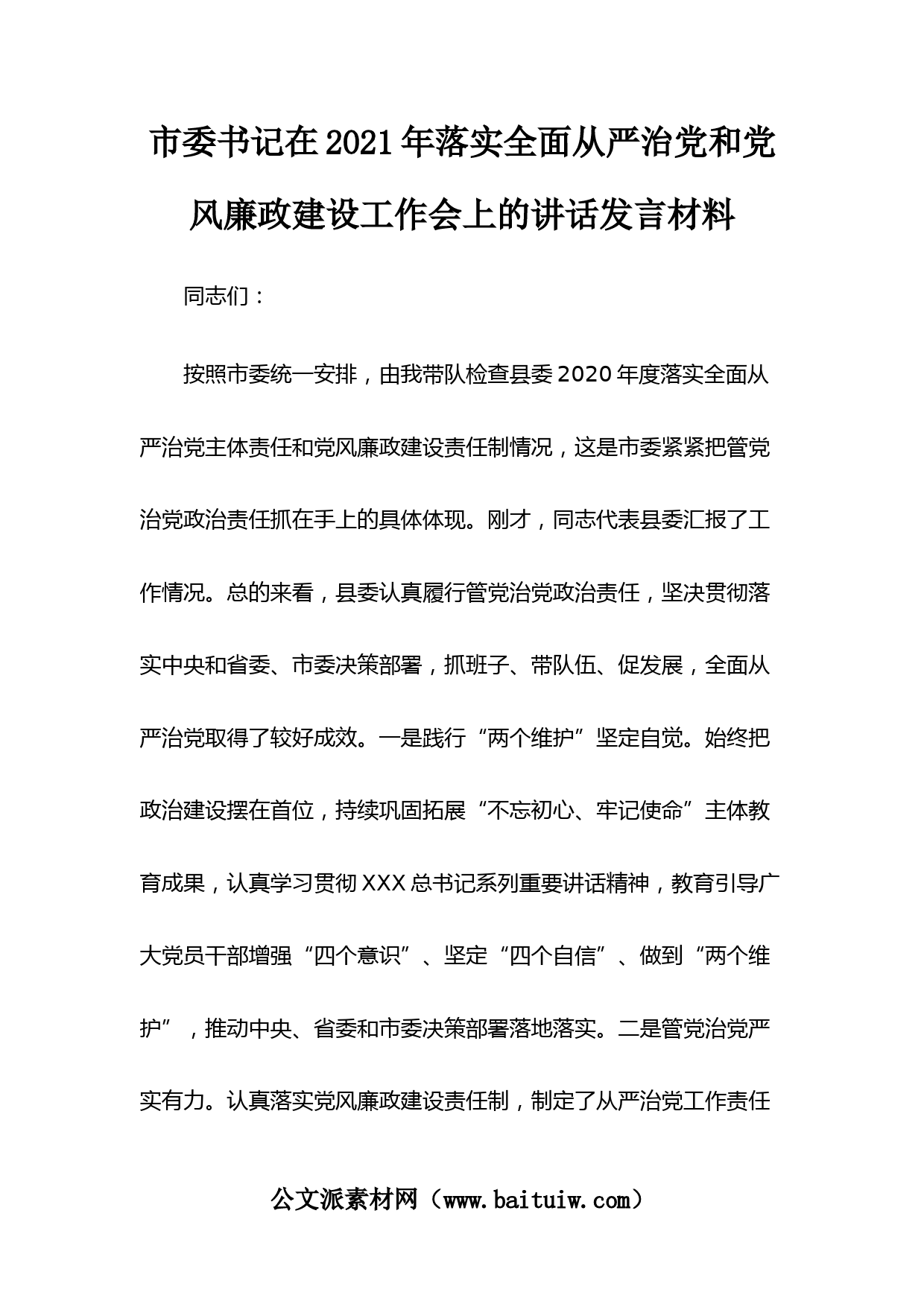 市委書記在2021年落實全面從嚴治黨和黨風廉政建設工作會上的講話發(fā)言材料VIP免費