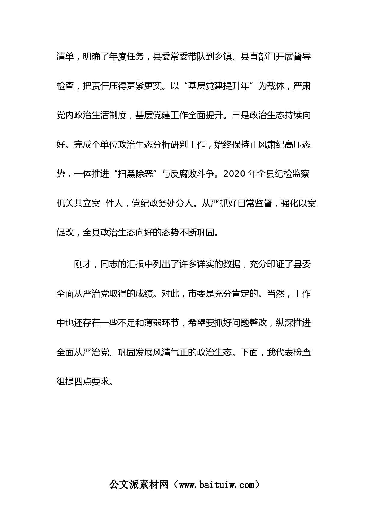 市委書記在2021年落實全面從嚴治黨和黨風廉政建設工作會上的講話發(fā)言材料同志們:按照市委統(tǒng)一安排,由我?guī)ш牂z查縣委2020年度落實全面從嚴治黨主體責任和黨風廉政建設責任制情況,這是市委緊緊把管黨治黨政治責任抓在手上的具體體現(xiàn)。剛才,同志代表縣委匯報了工作情況??偟膩砜?,縣委認真履行管黨治黨政治責任,堅決貫徹落實中央和省委、市委決策部署,抓班子、帶隊伍、促發(fā)展,全面從嚴治黨取得了較好成效。一是踐行“兩個維護”堅定自覺。始終把政治建設擺在首位,持續(xù)鞏固拓展“不忘初心、牢記使命”主體教育成果,認真學習貫徹XXX總書記系列重要講話精神,教育引...