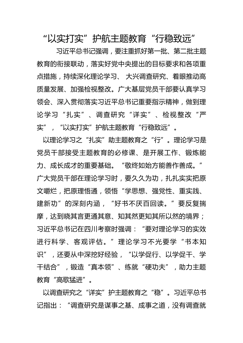 “以實(shí)打?qū)崱弊o(hù)航主題教育“行穩(wěn)致遠(yuǎn)”習(xí)近平總書記強(qiáng)調(diào),要注重抓好第一批、第二批主題教育的銜接聯(lián)動(dòng),落實(shí)好黨中央提出的目標(biāo)要求和各項(xiàng)重點(diǎn)措施,持續(xù)深化理論學(xué)習(xí)、大興調(diào)查研究、著眼推動(dòng)高質(zhì)量發(fā)展、加強(qiáng)檢視整改。廣大基層黨員干部要認(rèn)真學(xué)習(xí)領(lǐng)會(huì)、深入貫徹落實(shí)習(xí)近平總書記重要指示精神,做到理論學(xué)習(xí)“扎實(shí)”、調(diào)查研究“詳實(shí)”、檢視整改“嚴(yán)實(shí)”,“以實(shí)打?qū)崱弊o(hù)航主題教育“行穩(wěn)致遠(yuǎn)”。以理論學(xué)習(xí)之“扎實(shí)”助主題教育之“行”。理論學(xué)習(xí)是黨員干部接受主題教育的必修課、是開展工作、鍛煉能力、成長成才的重要基礎(chǔ)?!熬唇K如始方能善作善成。”廣大黨員干...