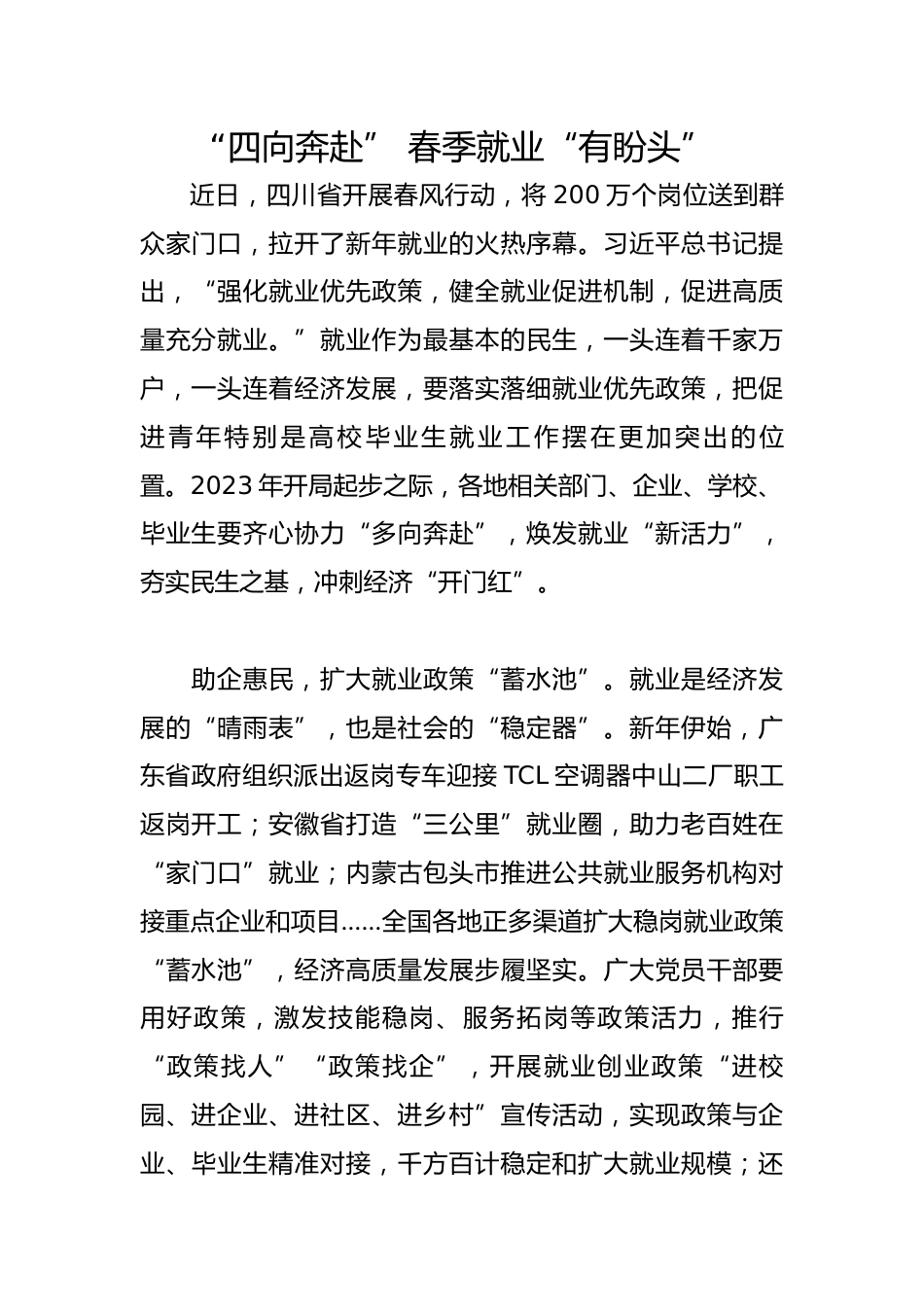 “四向奔赴”春季就業(yè)“有盼頭”近日,四川省開(kāi)展春風(fēng)行動(dòng),將200萬(wàn)個(gè)崗位送到群眾家門(mén)口,拉開(kāi)了新年就業(yè)的火熱序幕。習(xí)近平總書(shū)記提出,“強(qiáng)化就業(yè)優(yōu)先政策,健全就業(yè)促進(jìn)機(jī)制,促進(jìn)高質(zhì)量充分就業(yè)?!本蜆I(yè)作為最基本的民生,一頭連著千家萬(wàn)戶,一頭連著經(jīng)濟(jì)發(fā)展,要落實(shí)落細(xì)就業(yè)優(yōu)先政策,把促進(jìn)青年特別是高校畢業(yè)生就業(yè)工作擺在更加突出的位置。2023年開(kāi)局起步之際,各地相關(guān)部門(mén)、企業(yè)、學(xué)校、畢業(yè)生要齊心協(xié)力“多向奔赴”,煥發(fā)就業(yè)“新活力”,夯實(shí)民生之基,沖刺經(jīng)濟(jì)“開(kāi)門(mén)紅”。助企惠民,擴(kuò)大就業(yè)政策“蓄水池”。就業(yè)是經(jīng)濟(jì)發(fā)展的“晴雨表”,也是社會(huì)的“...