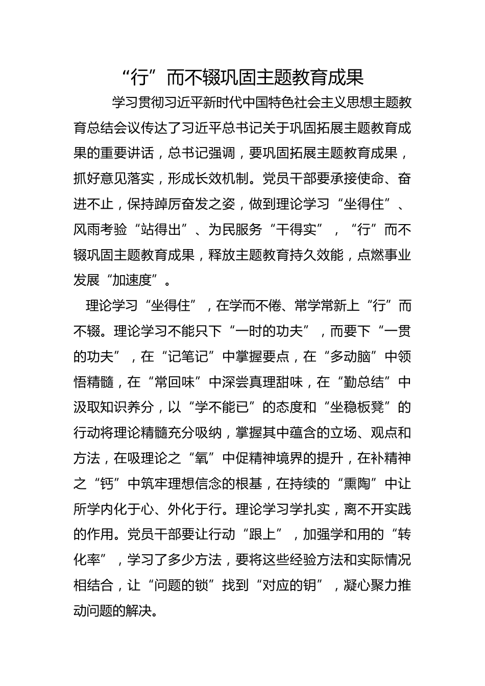 “行”而不輟鞏固主題教育成果學習貫徹習近平新時代中國特色社會主義思想主題教育總結會議傳達了習近平總書記關于鞏固拓展主題教育成果的重要講話,總書記強調,要鞏固拓展主題教育成果,抓好意見落實,形成長效機制。黨員干部要承接使命、奮進不止,保持踔厲奮發(fā)之姿,做到理論學習“坐得住”、風雨考驗“站得出”、為民服務“干得實”,“行”而不輟鞏固主題教育成果,釋放主題教育持久效能,點燃事業(yè)發(fā)展“加速度”。理論學習“坐得住”,在學而不倦、常學常新上“行”而不輟。理論學習不能只下“一時的功夫”,而要下“一貫的功夫”,在“記筆記”中掌握要點,在“多...