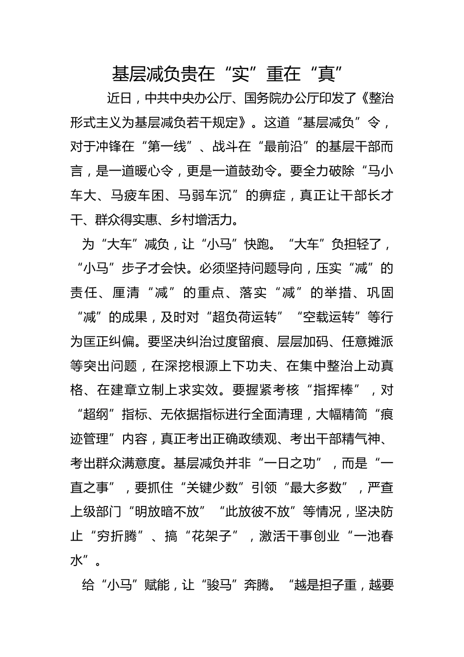 基層減負(fù)貴在“實(shí)”重在“真”近日,中共中央辦公廳、國(guó)務(wù)院辦公廳印發(fā)了《整治形式主義為基層減負(fù)若干規(guī)定》。這道“基層減負(fù)”令,對(duì)于沖鋒在“第一線(xiàn)”、戰(zhàn)斗在“最前沿”的基層干部而言,是一道暖心令,更是一道鼓勁令。要全力破除“馬小車(chē)大、馬疲車(chē)?yán)?、馬弱車(chē)沉”的痹癥,真正讓干部長(zhǎng)才干、群眾得實(shí)惠、鄉(xiāng)村增活力。為“大車(chē)”減負(fù),讓“小馬”快跑。“大車(chē)”負(fù)擔(dān)輕了,“小馬”步子才會(huì)快。必須堅(jiān)持問(wèn)題導(dǎo)向,壓實(shí)“減”的責(zé)任、厘清“減”的重點(diǎn)、落實(shí)“減”的舉措、鞏固“減”的成果,及時(shí)對(duì)“超負(fù)荷運(yùn)轉(zhuǎn)”“空載運(yùn)轉(zhuǎn)”等行為匡正糾偏。要堅(jiān)決糾治過(guò)度留痕、層...