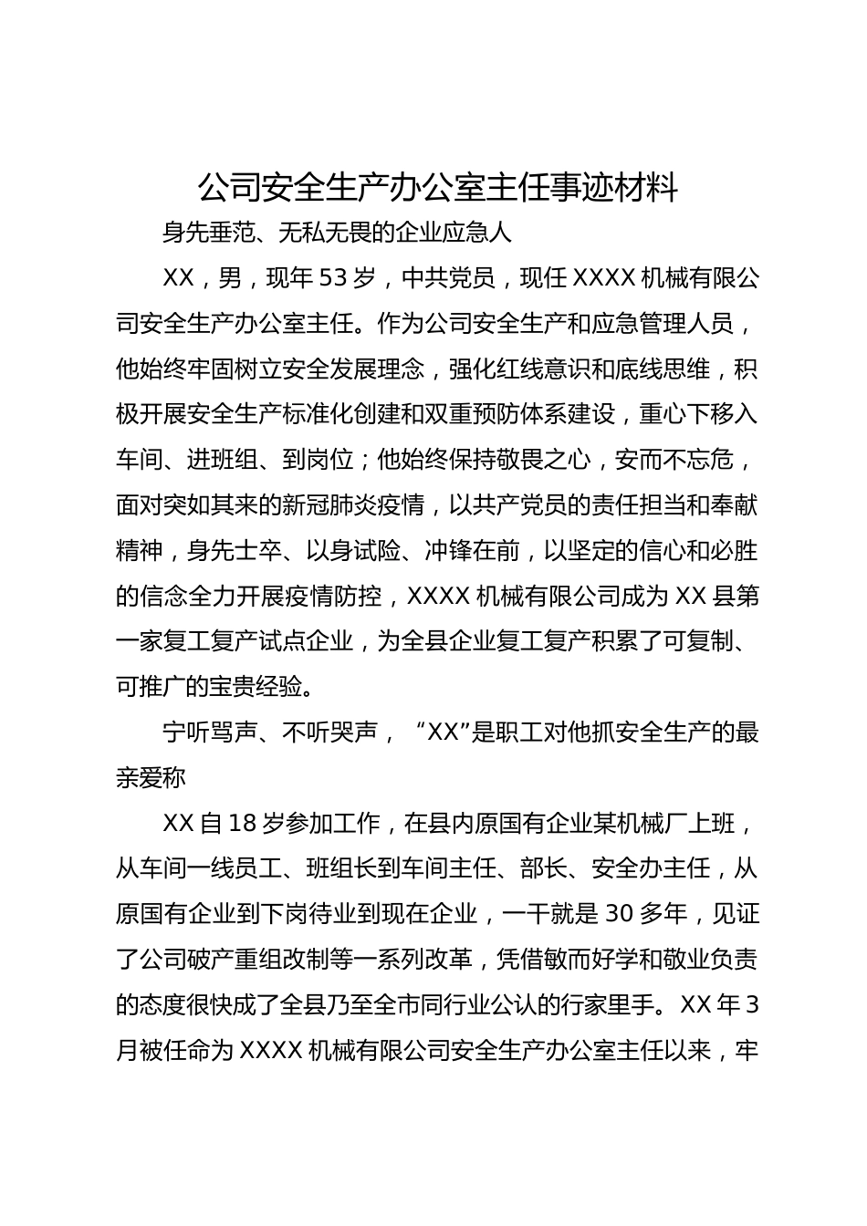 公司安全生產(chǎn)辦公室主任事跡材料身先垂范、無私無畏的企業(yè)應(yīng)急人XX,男,現(xiàn)年53歲,中共黨員,現(xiàn)任XXXX機(jī)械有限公司安全生產(chǎn)辦公室主任。作為公司安全生產(chǎn)和應(yīng)急管理人員,他始終牢固樹立安全發(fā)展理念,強(qiáng)化紅線意識和底線思維,積極開展安全生產(chǎn)標(biāo)準(zhǔn)化創(chuàng)建和雙重預(yù)防體系建設(shè),重心下移入車間、進(jìn)班組、到崗位;他始終保持敬畏之心,安而不忘危,面對突如其來的新冠肺炎疫情,以共產(chǎn)黨員的責(zé)任擔(dān)當(dāng)和奉獻(xiàn)精神,身先士卒、以身試險(xiǎn)、沖鋒在前,以堅(jiān)定的信心和必勝的信念全力開展疫情防控,XXXX機(jī)械有限公司成為XX縣第一家復(fù)工復(fù)產(chǎn)試點(diǎn)企業(yè),為全縣企業(yè)復(fù)工復(fù)產(chǎn)積累了可復(fù)...