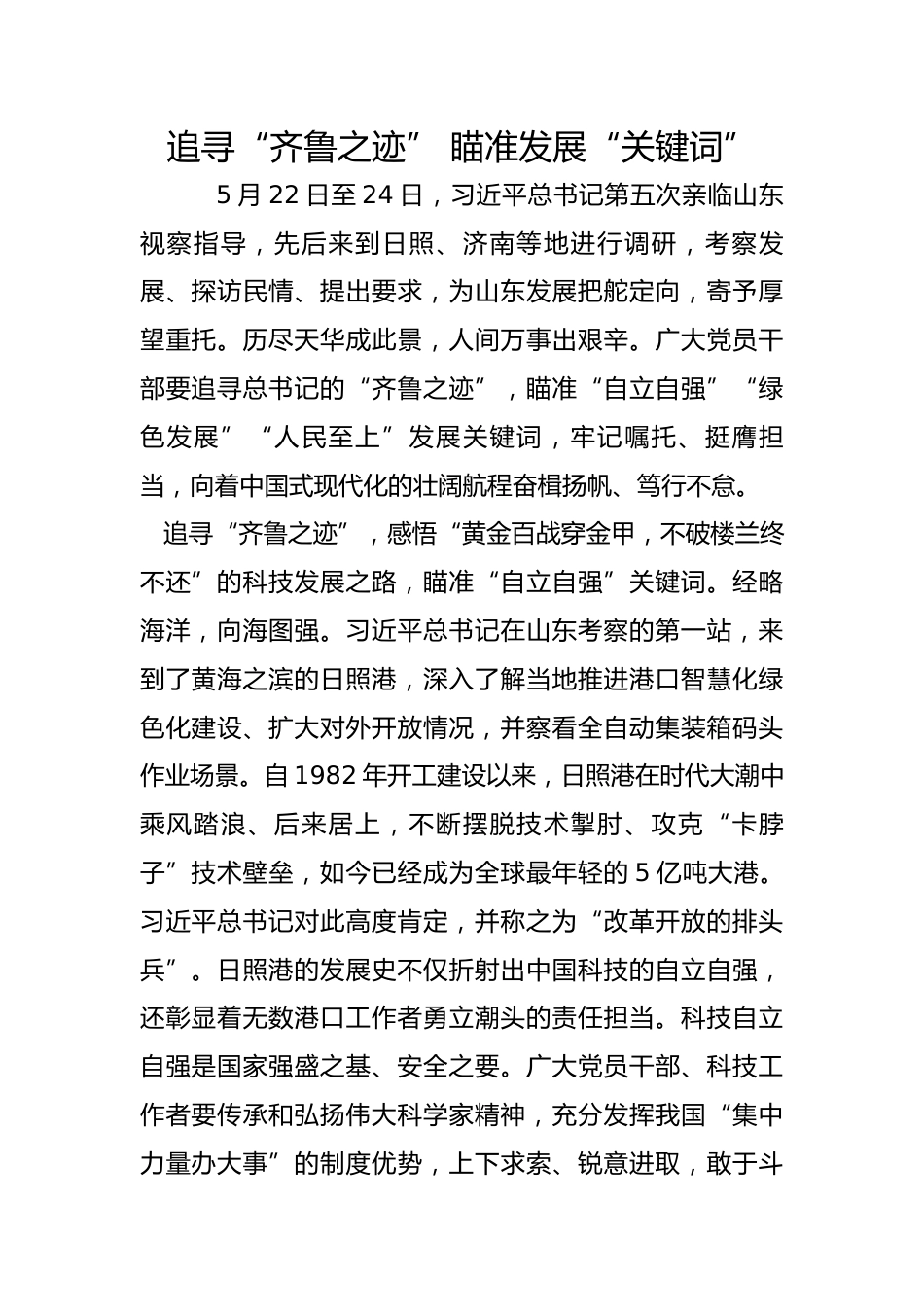 追尋“齊魯之跡”瞄準(zhǔn)發(fā)展“關(guān)鍵詞”5月22日至24日,習(xí)近平總書記第五次親臨山東視察指導(dǎo),先后來到日照、濟(jì)南等地進(jìn)行調(diào)研,考察發(fā)展、探訪民情、提出要求,為山東發(fā)展把舵定向,寄予厚望重托。歷盡天華成此景,人間萬事出艱辛。廣大黨員干部要追尋總書記的“齊魯之跡”,瞄準(zhǔn)“自立自強(qiáng)”“綠色發(fā)展”“人民至上”發(fā)展關(guān)鍵詞,牢記囑托、挺膺擔(dān)當(dāng),向著中國式現(xiàn)代化的壯闊航程奮楫揚帆、篤行不怠。追尋“齊魯之跡”,感悟“黃金百戰(zhàn)穿金甲,不破樓蘭終不還”的科技發(fā)展之路,瞄準(zhǔn)“自立自強(qiáng)”關(guān)鍵詞。經(jīng)略海洋,向海圖強(qiáng)。習(xí)近平總書記在山東考察的第一站,來到了黃海...