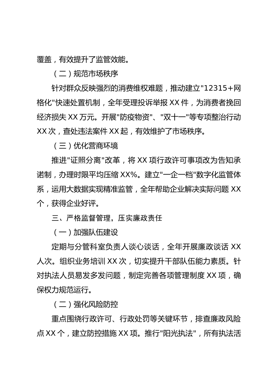 2024年分管領(lǐng)導(dǎo)個(gè)人述責(zé)述廉報(bào)告(市場(chǎng)監(jiān)管)作為分管市場(chǎng)監(jiān)督管理工作的副局長(zhǎng),我始終牢記"兩個(gè)確立"的決定性意義,堅(jiān)持以習(xí)近平新時(shí)代中國(guó)特色社會(huì)主義思想為指導(dǎo),嚴(yán)格履行全面從嚴(yán)治黨主體責(zé)任和"一崗雙責(zé)"?,F(xiàn)將我2024年度履行黨風(fēng)廉政建設(shè)責(zé)任制和廉潔自律情況報(bào)告如下:一、強(qiáng)化理論武裝,筑牢思想根基始終把政治建設(shè)擺在首位,帶頭學(xué)習(xí)貫徹習(xí)近平新時(shí)代中國(guó)特色社會(huì)主義思想和黨的二十大精神。全年參加黨組理論學(xué)習(xí)中心組學(xué)習(xí)XX次,記學(xué)習(xí)筆記XX萬(wàn)字,撰寫心得體會(huì)XX篇。特別是在學(xué)習(xí)貫徹二十屆三中全會(huì)精神過(guò)程中,我深入基層一線開展宣講XX場(chǎng),確保黨的創(chuàng)新理...