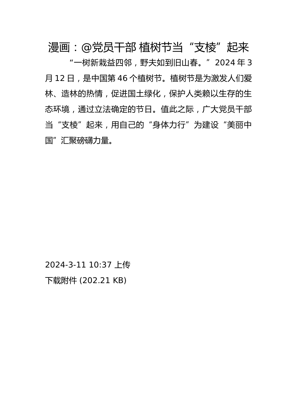 漫畫:@黨員干部植樹節(jié)當“支棱”起來“一樹新栽益四鄰,野夫如到舊山春?!?024年3月12日,是中國第46個植樹節(jié)。植樹節(jié)是為激發(fā)人們愛林、造林的熱情,促進國土綠化,保護人類賴以生存的生態(tài)環(huán)境,通過立法確定的節(jié)日。值此之際,廣大黨員干部當“支棱”起來,用自己的“身體力行”為建設“美麗中國”匯聚磅礴力量。2024-3-1110:37上傳下載附件(202.21KB)理論學習“支棱起來”,做建設美麗中國的“引領者”。對于黨員干部而言,“植樹節(jié)”不應該僅是于曠野間種下一棵小樹,更需要把生態(tài)文明理念這棵參天巨木根植在自己心中?!爸?,則行之愈篤?!睆V大黨員干部要堅...