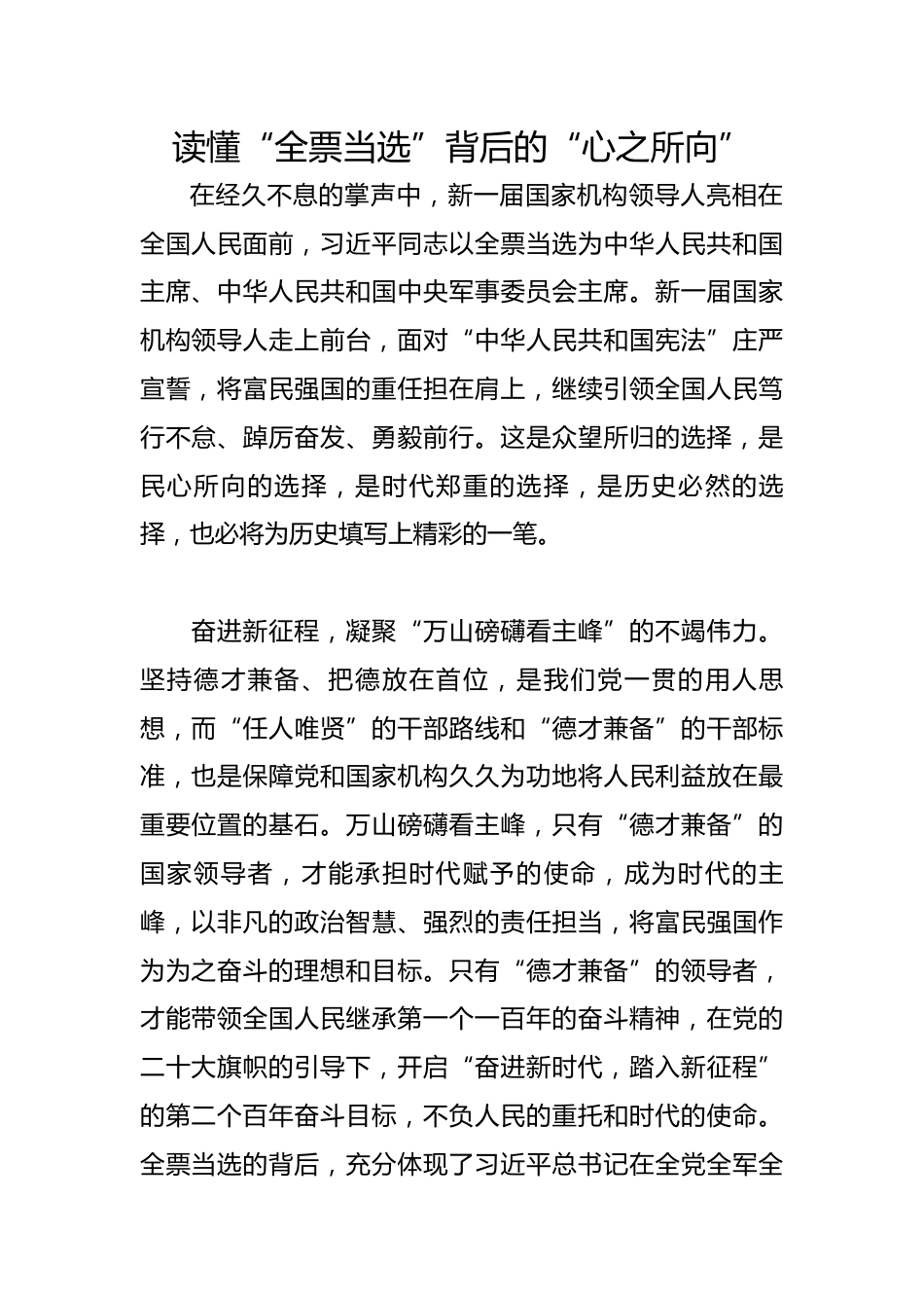 讀懂“全票當(dāng)選”背后的“心之所向”在經(jīng)久不息的掌聲中,新一屆國(guó)家機(jī)構(gòu)領(lǐng)導(dǎo)人亮相在全國(guó)人民面前,習(xí)近平同志以全票當(dāng)選為中華人民共和國(guó)主席、中華人民共和國(guó)中央軍事委員會(huì)主席。新一屆國(guó)家機(jī)構(gòu)領(lǐng)導(dǎo)人走上前臺(tái),面對(duì)“中華人民共和國(guó)憲法”莊嚴(yán)宣誓,將富民強(qiáng)國(guó)的重任擔(dān)在肩上,繼續(xù)引領(lǐng)全國(guó)人民篤行不怠、踔厲奮發(fā)、勇毅前行。這是眾望所歸的選擇,是民心所向的選擇,是時(shí)代鄭重的選擇,是歷史必然的選擇,也必將為歷史填寫上精彩的一筆。奮進(jìn)新征程,凝聚“萬(wàn)山磅礴看主峰”的不竭偉力。堅(jiān)持德才兼?zhèn)?、把德放在首位,是我們黨一貫的用人思想,而“任人唯賢”的干部...