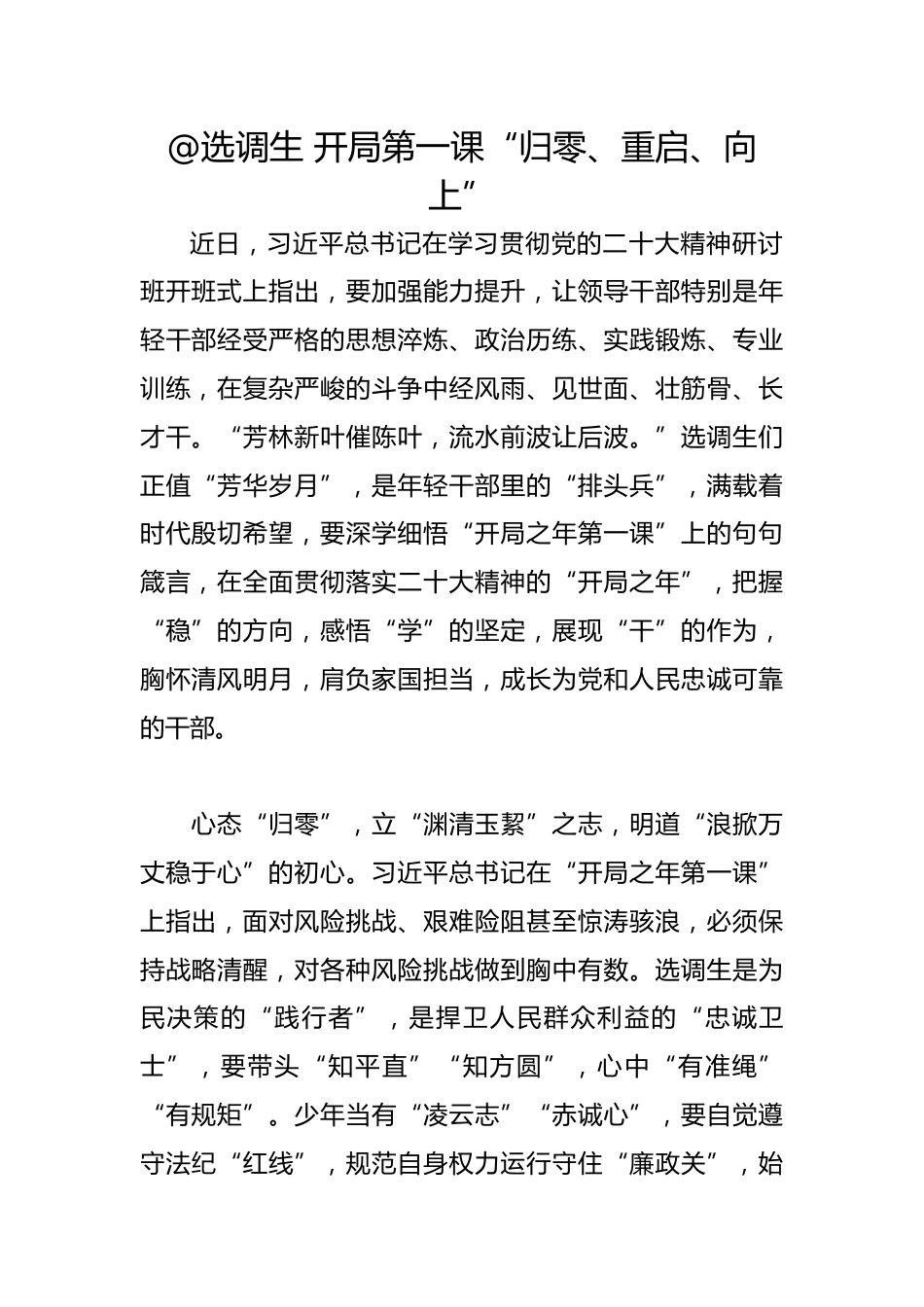 @選調(diào)生開局第一課“歸零、重啟、向上”近日,習(xí)近平總書記在學(xué)習(xí)貫徹黨的二十大精神研討班開班式上指出,要加強(qiáng)能力提升,讓領(lǐng)導(dǎo)干部特別是年輕干部經(jīng)受嚴(yán)格的思想淬煉、政治歷練、實(shí)踐鍛煉、專業(yè)訓(xùn)練,在復(fù)雜嚴(yán)峻的斗爭中經(jīng)風(fēng)雨、見世面、壯筋骨、長才干?!胺剂中氯~催陳葉,流水前波讓后波?!边x調(diào)生們正值“芳華歲月”,是年輕干部里的“排頭兵”,滿載著時(shí)代殷切希望,要深學(xué)細(xì)悟“開局之年第一課”上的句句箴言,在全面貫徹落實(shí)二十大精神的“開局之年”,把握“穩(wěn)”的方向,感悟“學(xué)”的堅(jiān)定,展現(xiàn)“干”的作為,胸懷清風(fēng)明月,肩負(fù)家國擔(dān)當(dāng),成長為黨和人民忠誠...
