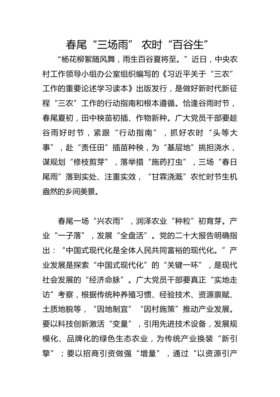 春尾“三場(chǎng)雨”農(nóng)時(shí)“百谷生”“楊花柳絮隨風(fēng)舞,雨生百谷夏將至?!苯?,中央農(nóng)村工作領(lǐng)導(dǎo)小組辦公室組織編寫的《習(xí)近平關(guān)于“三農(nóng)”工作的重要論述學(xué)習(xí)讀本》出版發(fā)行,是做好新時(shí)代新征程“三農(nóng)”工作的行動(dòng)指南和根本遵循。恰逢谷雨時(shí)節(jié),春尾夏初,田中秧苗初插、作物新種。廣大黨員干部要趁谷雨好時(shí)節(jié),緊跟“行動(dòng)指南”,抓好農(nóng)時(shí)“頭等大事”,赴“責(zé)任田”插苗種秧,為“基層地”挑擔(dān)澆水,謀規(guī)劃“修枝剪芽”,落舉措“施藥打蟲”,三場(chǎng)“春日尾雨”落到實(shí)處、注重實(shí)效,“甘霖澆溉”農(nóng)忙時(shí)節(jié)生機(jī)盎然的鄉(xiāng)間美景。春尾一場(chǎng)“興農(nóng)雨”,潤(rùn)澤農(nóng)業(yè)“種?!背跤?..