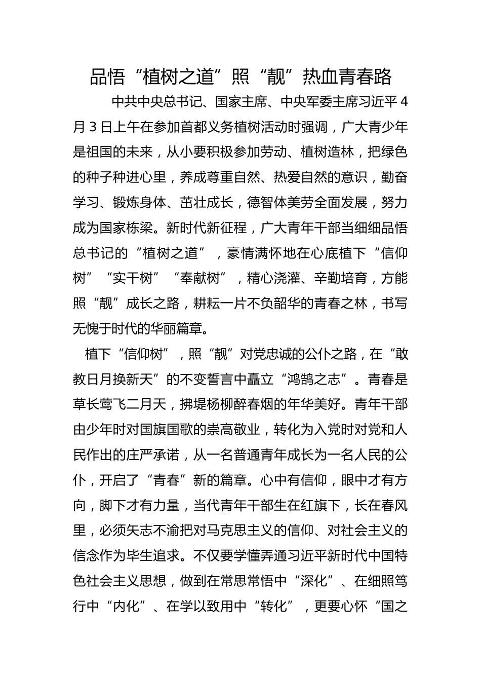 品悟“植樹(shù)之道”照“靚”熱血青春路中共中央總書(shū)記、國(guó)家主席、中央軍委主席習(xí)近平4月3日上午在參加首都義務(wù)植樹(shù)活動(dòng)時(shí)強(qiáng)調(diào),廣大青少年是祖國(guó)的未來(lái),從小要積極參加勞動(dòng)、植樹(shù)造林,把綠色的種子種進(jìn)心里,養(yǎng)成尊重自然、熱愛(ài)自然的意識(shí),勤奮學(xué)習(xí)、鍛煉身體、茁壯成長(zhǎng),德智體美勞全面發(fā)展,努力成為國(guó)家棟梁。新時(shí)代新征程,廣大青年干部當(dāng)細(xì)細(xì)品悟總書(shū)記的“植樹(shù)之道”,豪情滿懷地在心底植下“信仰樹(shù)”“實(shí)干樹(shù)”“奉獻(xiàn)樹(shù)”,精心澆灌、辛勤培育,方能照“靚”成長(zhǎng)之路,耕耘一片不負(fù)韶華的青春之林,書(shū)寫(xiě)無(wú)愧于時(shí)代的華麗篇章。植下“信仰樹(shù)”,照“靚”對(duì)黨忠誠(chéng)...