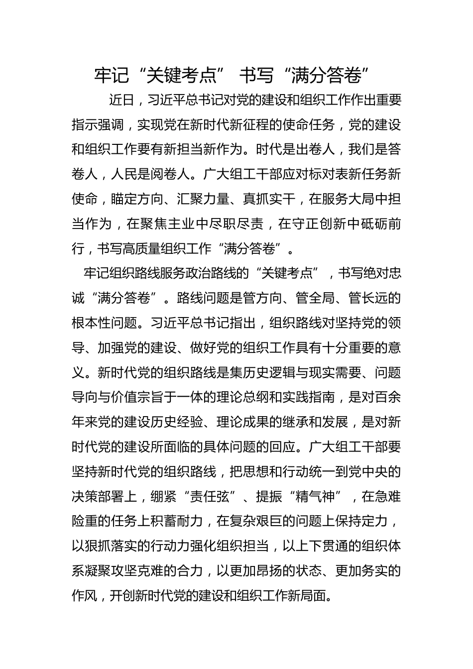 牢記“關鍵考點”書寫“滿分答卷”近日,習近平總書記對黨的建設和組織工作作出重要指示強調,實現(xiàn)黨在新時代新征程的使命任務,黨的建設和組織工作要有新?lián)斝伦鳛?。時代是出卷人,我們是答卷人,人民是閱卷人。廣大組工干部應對標對表新任務新使命,瞄定方向、匯聚力量、真抓實干,在服務大局中擔當作為,在聚焦主業(yè)中盡職盡責,在守正創(chuàng)新中砥礪前行,書寫高質量組織工作“滿分答卷”。牢記組織路線服務政治路線的“關鍵考點”,書寫絕對忠誠“滿分答卷”。路線問題是管方向、管全局、管長遠的根本性問題。習近平總書記指出,組織路線對堅持黨的領導、加強黨的建設、...