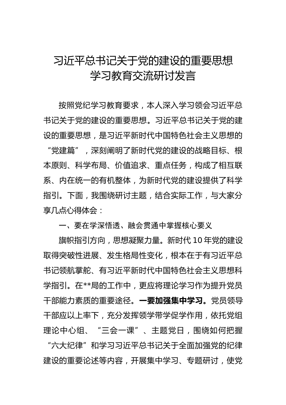習(xí)近平總書記關(guān)于黨的建設(shè)的重要思想學(xué)習(xí)教育交流研討發(fā)言按照黨紀學(xué)習(xí)教育要求,本人深入學(xué)習(xí)領(lǐng)會習(xí)近平總書記關(guān)于黨的建設(shè)的重要思想。習(xí)近平總書記關(guān)于黨的建設(shè)的重要思想,是習(xí)近平新時代中國特色社會主義思想的“黨建篇”,深刻闡明了新時代黨的建設(shè)的戰(zhàn)略目標、根本原則、科學(xué)布局、價值追求、重點任務(wù),構(gòu)成了相互聯(lián)系、內(nèi)在統(tǒng)一的有機整體,為新時代黨的建設(shè)提供了科學(xué)指引。下面,我圍繞研討主題,結(jié)合實際工作,與大家分享幾點心得體會:一、要在學(xué)深悟透、融會貫通中掌握核心要義旗幟指引方向,思想凝聚力量。新時代10年黨的建設(shè)取得突破性進展、發(fā)生格局性變...