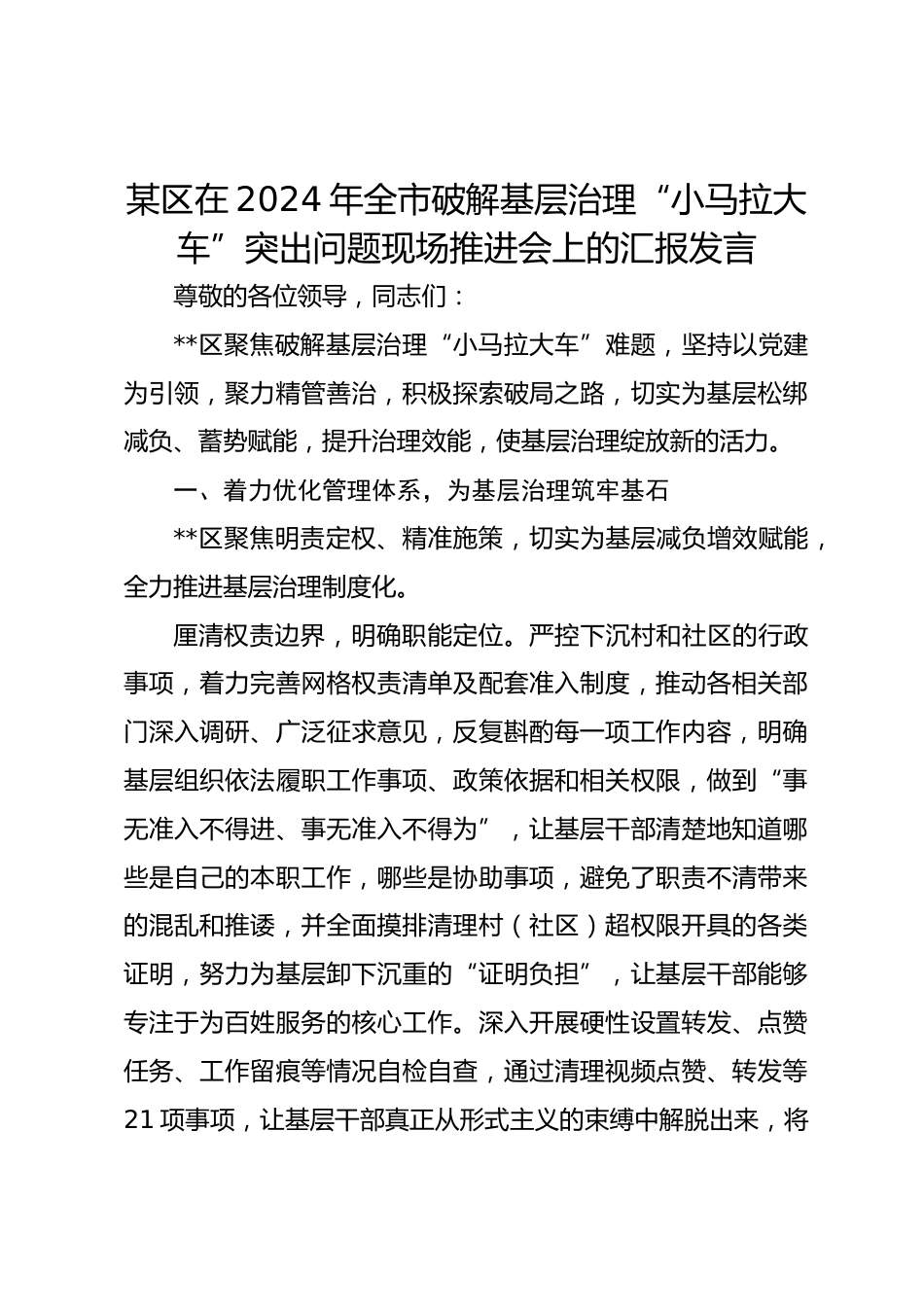 某區(qū)在2024年全市破解基層治理“小馬拉大車”突出問題現(xiàn)場推進(jìn)會上的匯報發(fā)言VIP免費(fèi)