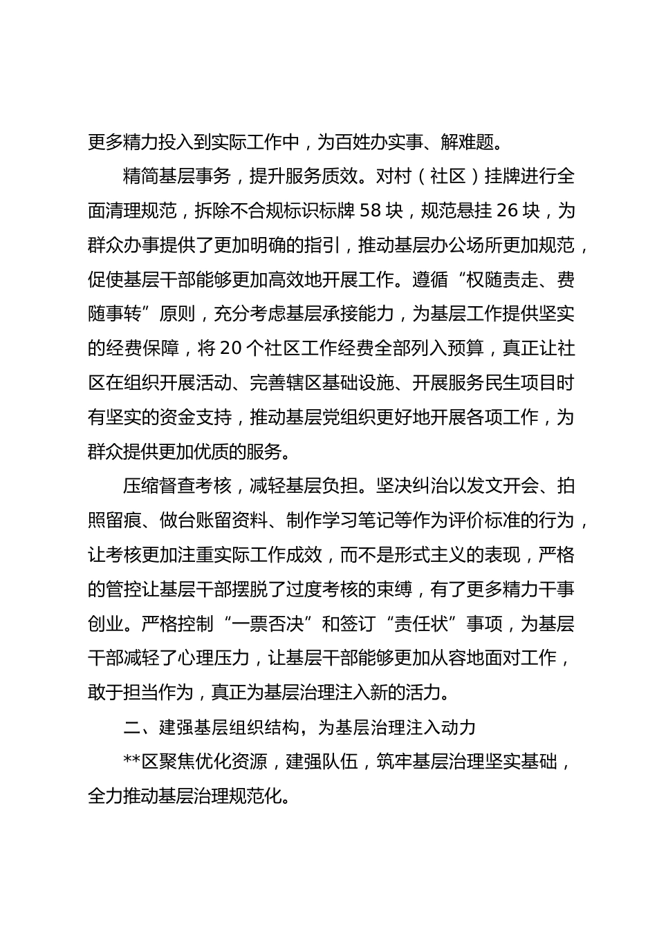 某區(qū)在2024年全市破解基層治理“小馬拉大車”突出問題現(xiàn)場推進(jìn)會上的匯報發(fā)言尊敬的各位領(lǐng)導(dǎo),同志們:**區(qū)聚焦破解基層治理“小馬拉大車”難題,堅(jiān)持以黨建為引領(lǐng),聚力精管善治,積極探索破局之路,切實(shí)為基層松綁減負(fù)、蓄勢賦能,提升治理效能,使基層治理綻放新的活力。一、著力優(yōu)化管理體系,為基層治理筑牢基石**區(qū)聚焦明責(zé)定權(quán)、精準(zhǔn)施策,切實(shí)為基層減負(fù)增效賦能,全力推進(jìn)基層治理制度化。厘清權(quán)責(zé)邊界,明確職能定位。嚴(yán)控下沉村和社區(qū)的行政事項(xiàng),著力完善網(wǎng)格權(quán)責(zé)清單及配套準(zhǔn)入制度,推動各相關(guān)部門深入調(diào)研、廣泛征求意見,反復(fù)斟酌每一項(xiàng)工作內(nèi)容,明確基...