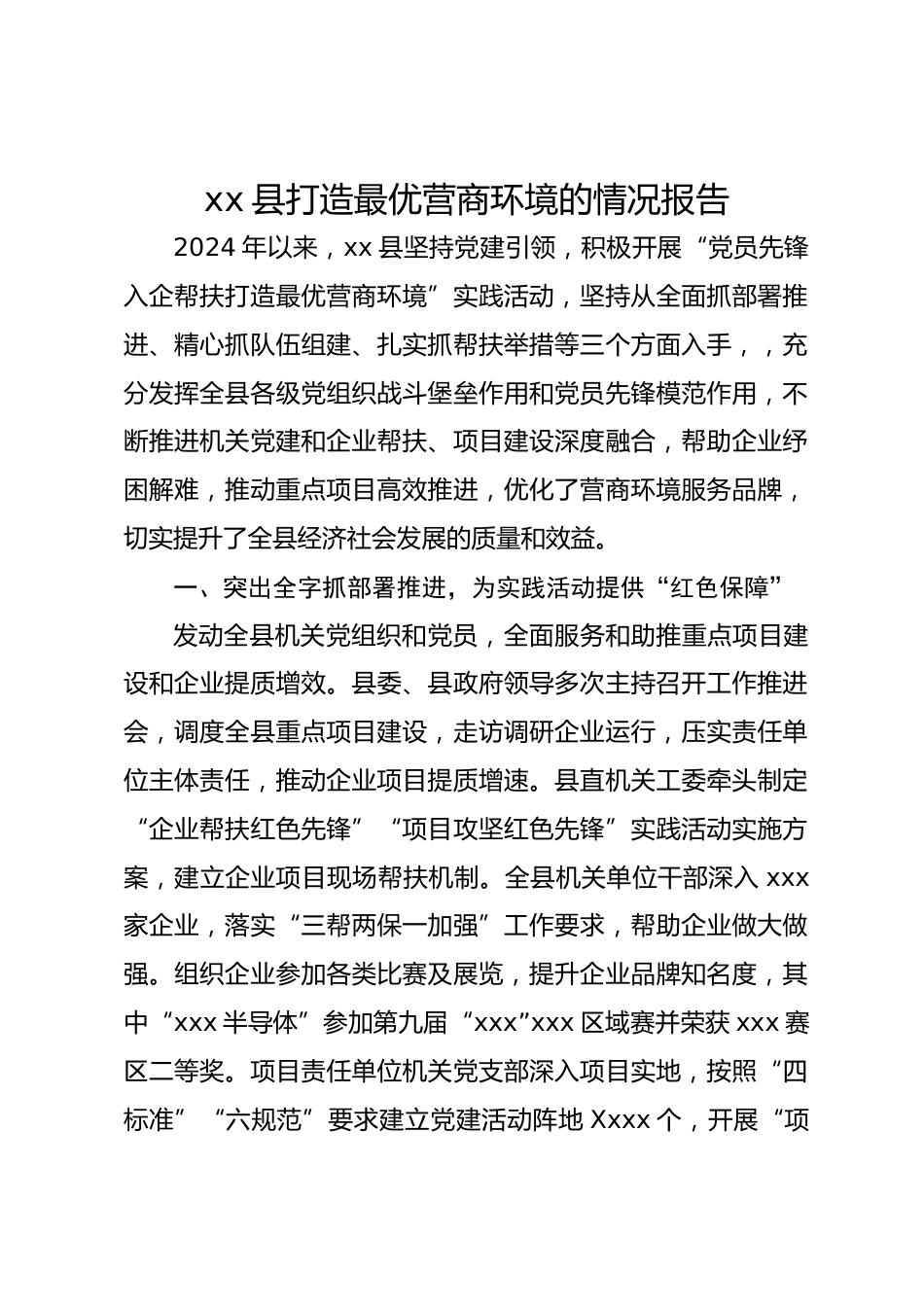 xx縣打造最優(yōu)營商環(huán)境的情況報(bào)告2024年以來,xx縣堅(jiān)持黨建引領(lǐng),積極開展“黨員先鋒入企幫扶打造最優(yōu)營商環(huán)境”實(shí)踐活動(dòng),堅(jiān)持從全面抓部署推進(jìn)、精心抓隊(duì)伍組建、扎實(shí)抓幫扶舉措等三個(gè)方面入手,,充分發(fā)揮全縣各級黨組織戰(zhàn)斗堡壘作用和黨員先鋒模范作用,不斷推進(jìn)機(jī)關(guān)黨建和企業(yè)幫扶、項(xiàng)目建設(shè)深度融合,幫助企業(yè)紓困解難,推動(dòng)重點(diǎn)項(xiàng)目高效推進(jìn),優(yōu)化了營商環(huán)境服務(wù)品牌,切實(shí)提升了全縣經(jīng)濟(jì)社會(huì)發(fā)展的質(zhì)量和效益。一、突出全字抓部署推進(jìn),為實(shí)踐活動(dòng)提供“紅色保障”發(fā)動(dòng)全縣機(jī)關(guān)黨組織和黨員,全面服務(wù)和助推重點(diǎn)項(xiàng)目建設(shè)和企業(yè)提質(zhì)增效??h委、縣政府領(lǐng)導(dǎo)多次主持...