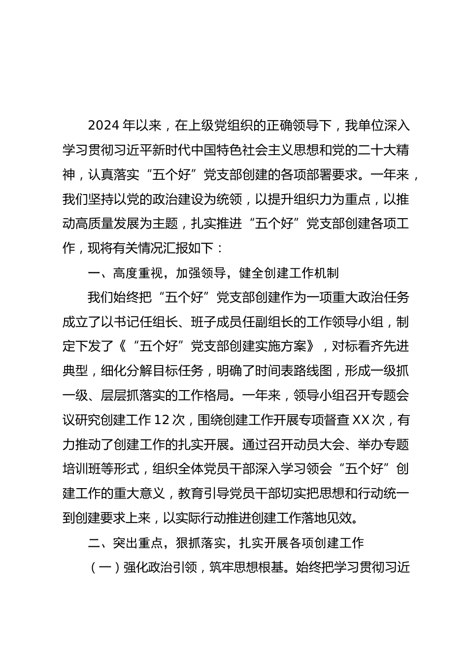 2024年以來,在上級(jí)黨組織的正確領(lǐng)導(dǎo)下,我單位深入學(xué)習(xí)貫徹習(xí)近平新時(shí)代中國特色社會(huì)主義思想和黨的二十大精神,認(rèn)真落實(shí)“五個(gè)好”黨支部創(chuàng)建的各項(xiàng)部署要求。一年來,我們堅(jiān)持以黨的政治建設(shè)為統(tǒng)領(lǐng),以提升組織力為重點(diǎn),以推動(dòng)高質(zhì)量發(fā)展為主題,扎實(shí)推進(jìn)“五個(gè)好”黨支部創(chuàng)建各項(xiàng)工作,現(xiàn)將有關(guān)情況匯報(bào)如下:一、高度重視,加強(qiáng)領(lǐng)導(dǎo),健全創(chuàng)建工作機(jī)制我們始終把“五個(gè)好”黨支部創(chuàng)建作為一項(xiàng)重大政治任務(wù)成立了以書記任組長、班子成員任副組長的工作領(lǐng)導(dǎo)小組,制定下發(fā)了《“五個(gè)好”黨支部創(chuàng)建實(shí)施方案》,對(duì)標(biāo)看齊先進(jìn)典型,細(xì)化分解目標(biāo)任務(wù),明確了時(shí)間表路線...