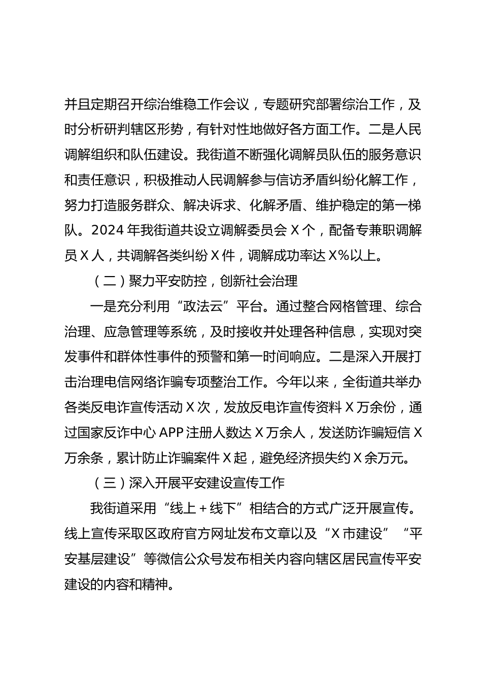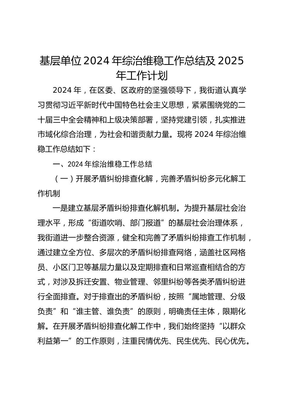 基層單位2024年綜治維穩(wěn)工作總結(jié)及2025年工作計(jì)劃2024年,在區(qū)委、區(qū)政府的堅(jiān)強(qiáng)領(lǐng)導(dǎo)下,我街道認(rèn)真學(xué)習(xí)貫徹習(xí)近平新時(shí)代中國(guó)特色社會(huì)主義思想,緊緊圍繞黨的二十屆三中全會(huì)精神和上級(jí)決策部署,堅(jiān)持黨建引領(lǐng),扎實(shí)推進(jìn)市域化綜合治理,為社會(huì)和諧貢獻(xiàn)力量?,F(xiàn)將2024年綜治維穩(wěn)工作總結(jié)如下:一、2024年綜治維穩(wěn)工作總結(jié)(一)開展矛盾糾紛排查化解,完善矛盾糾紛多元化解工作機(jī)制一是建立基層矛盾糾紛排查化解機(jī)制。為提升基層社會(huì)治理水平,形成“街道吹哨、部門報(bào)道”的基層社會(huì)治理體系,我街道進(jìn)一步整合資源,健全和完善了矛盾糾紛排查工作機(jī)制,通過(guò)建立全方位、多...