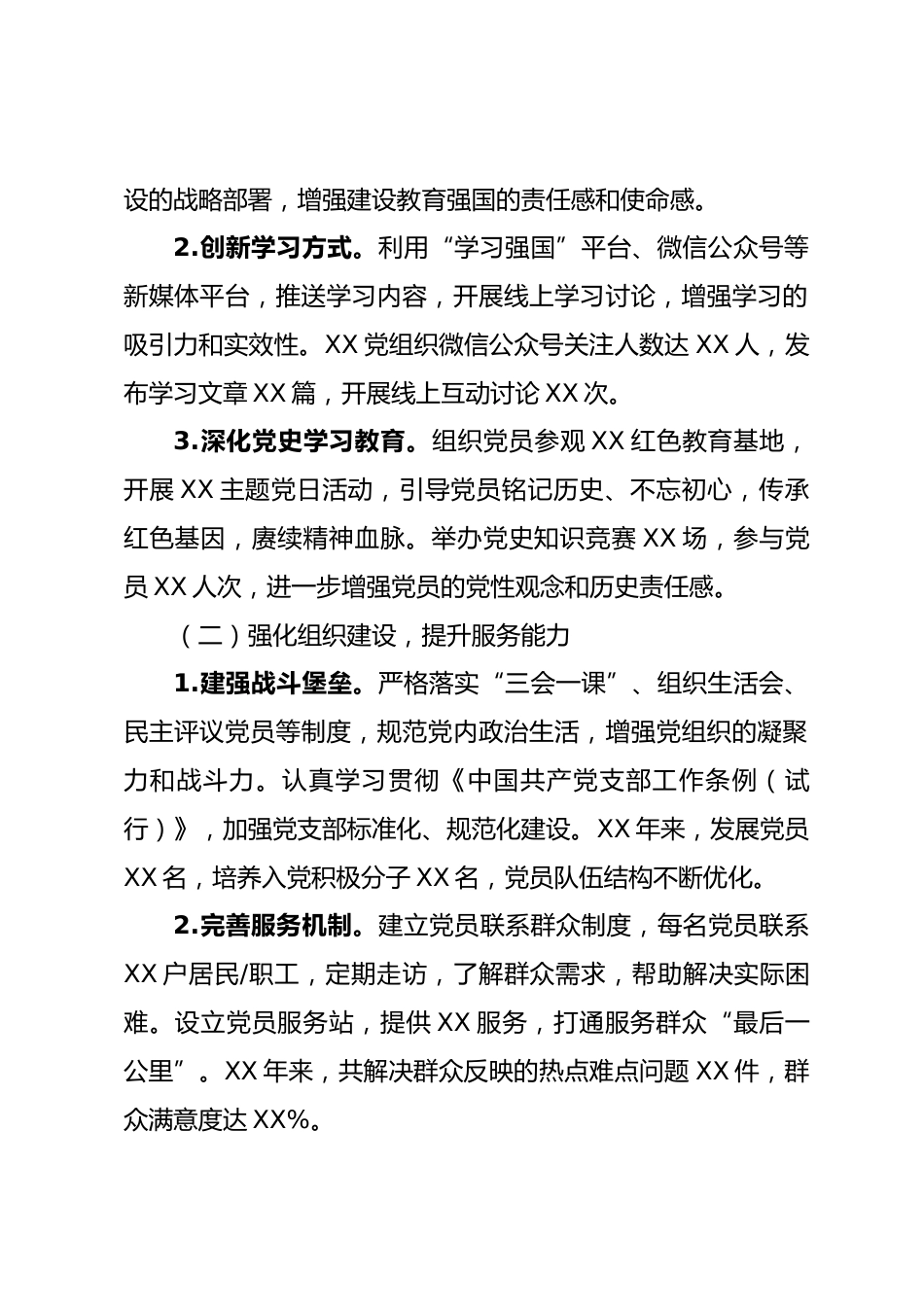 2024年XX基層黨組織打造黨建示范點(diǎn)材料一、基本情況XX基層黨組織位于XX,現(xiàn)有黨員XX名,覆蓋居民/職工XX戶(hù)/人。近年來(lái),XX黨組織堅(jiān)持以習(xí)近平新時(shí)代中國(guó)特色社會(huì)主義思想為指導(dǎo),深入學(xué)習(xí)貫徹黨的二十大精神,認(rèn)真落實(shí)二十屆三中全會(huì)關(guān)于完善黨的領(lǐng)導(dǎo)制度體系,加強(qiáng)黨的執(zhí)政能力建設(shè)的戰(zhàn)略部署,緊緊圍繞中心工作,以提升組織力為重點(diǎn),以服務(wù)群眾為核心,積極探索黨建工作新模式,努力打造“XX”黨建示范點(diǎn),取得了顯著成效。二、主要做法及成效(一)堅(jiān)持政治引領(lǐng),筑牢思想根基1.強(qiáng)化理論武裝。XX黨組織堅(jiān)持把學(xué)習(xí)貫徹習(xí)近平新時(shí)代中國(guó)特色社會(huì)主義思想和黨的二十大精...