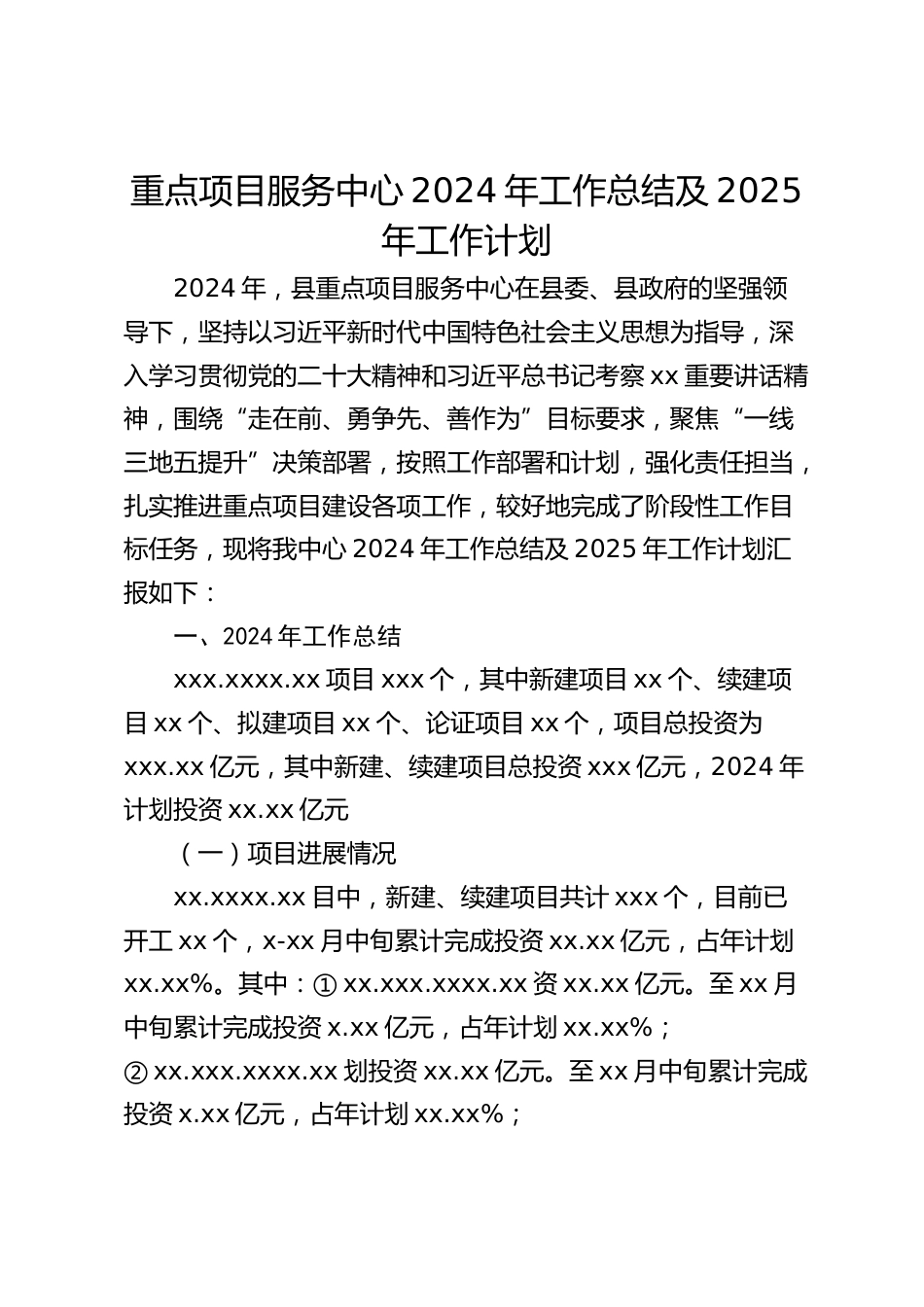 重點(diǎn)項(xiàng)目服務(wù)中心2024年工作總結(jié)及2025年工作計(jì)劃2024年,縣重點(diǎn)項(xiàng)目服務(wù)中心在縣委、縣政府的堅(jiān)強(qiáng)領(lǐng)導(dǎo)下,堅(jiān)持以習(xí)近平新時(shí)代中國特色社會(huì)主義思想為指導(dǎo),深入學(xué)習(xí)貫徹黨的二十大精神和習(xí)近平總書記考察xx重要講話精神,圍繞“走在前、勇爭先、善作為”目標(biāo)要求,聚焦“一線三地五提升”決策部署,按照工作部署和計(jì)劃,強(qiáng)化責(zé)任擔(dān)當(dāng),扎實(shí)推進(jìn)重點(diǎn)項(xiàng)目建設(shè)各項(xiàng)工作,較好地完成了階段性工作目標(biāo)任務(wù),現(xiàn)將我中心2024年工作總結(jié)及2025年工作計(jì)劃匯報(bào)如下:一、2024年工作總結(jié)xxx.xxxx.xx項(xiàng)目xxx個(gè),其中新建項(xiàng)目xx個(gè)、續(xù)建項(xiàng)目xx個(gè)、擬建項(xiàng)目xx個(gè)、論證項(xiàng)目xx個(gè),項(xiàng)目總...
