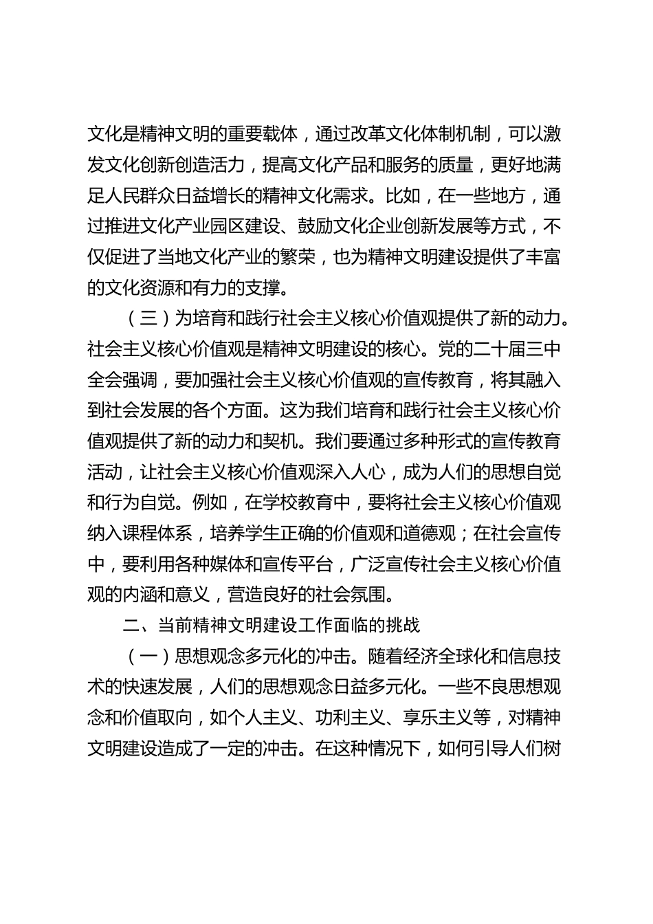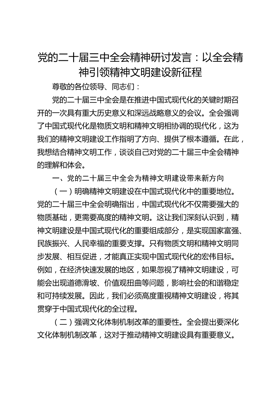 黨的二十屆三中全會精神研討發(fā)言:以全會精神引領(lǐng)精神文明建設(shè)新征程尊敬的各位領(lǐng)導(dǎo)、同志們:黨的二十屆三中全會是在推進(jìn)中國式現(xiàn)代化的關(guān)鍵時期召開的一次具有重大歷史意義和深遠(yuǎn)戰(zhàn)略意義的會議。全會強(qiáng)調(diào)了中國式現(xiàn)代化是物質(zhì)文明和精神文明相協(xié)調(diào)的現(xiàn)代化,這為我們的精神文明建設(shè)工作指明了方向、提供了根本遵循。在此,我想結(jié)合精神文明工作,談?wù)勛约簩h的二十屆三中全會精神的理解和體會。一、黨的二十屆三中全會為精神文明建設(shè)帶來新方向(一)明確精神文明建設(shè)在中國式現(xiàn)代化中的重要地位。黨的二十屆三中全會明確指出,中國式現(xiàn)代化不僅需要強(qiáng)大的物質(zhì)基礎(chǔ),...