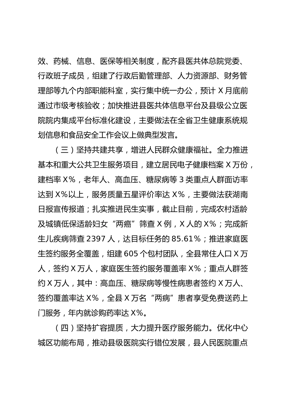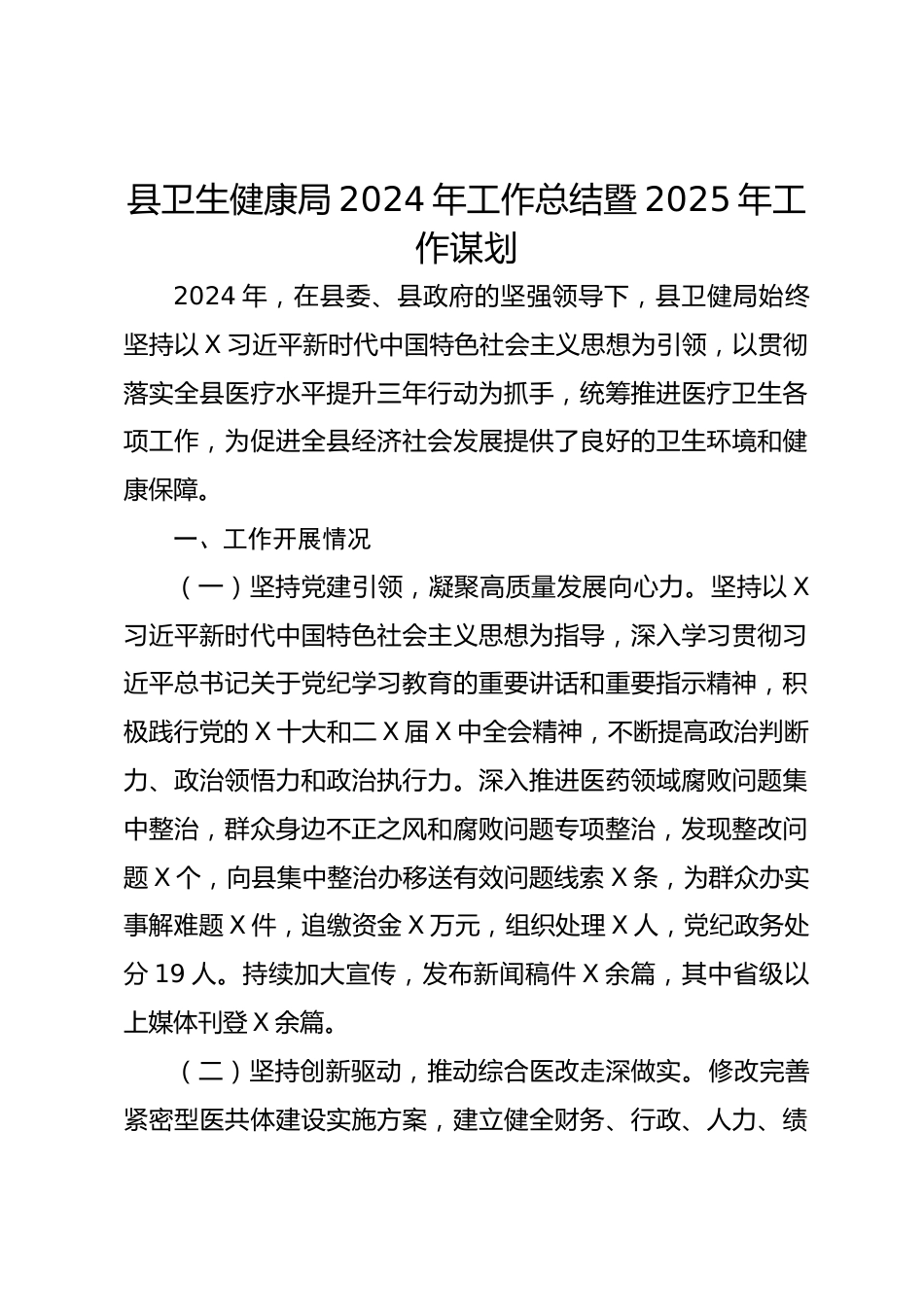 縣衛(wèi)生健康局2024年工作總結(jié)暨2025年工作謀劃2024年,在縣委、縣政府的堅(jiān)強(qiáng)領(lǐng)導(dǎo)下,縣衛(wèi)健局始終堅(jiān)持以X習(xí)近平新時(shí)代中國(guó)特色社會(huì)主義思想為引領(lǐng),以貫徹落實(shí)全縣醫(yī)療水平提升三年行動(dòng)為抓手,統(tǒng)籌推進(jìn)醫(yī)療衛(wèi)生各項(xiàng)工作,為促進(jìn)全縣經(jīng)濟(jì)社會(huì)發(fā)展提供了良好的衛(wèi)生環(huán)境和健康保障。一、工作開(kāi)展情況(一)堅(jiān)持黨建引領(lǐng),凝聚高質(zhì)量發(fā)展向心力。堅(jiān)持以X習(xí)近平新時(shí)代中國(guó)特色社會(huì)主義思想為指導(dǎo),深入學(xué)習(xí)貫徹習(xí)近平總書(shū)記關(guān)于黨紀(jì)學(xué)習(xí)教育的重要講話和重要指示精神,積極踐行黨的X十大和二X屆X中全會(huì)精神,不斷提高政治判斷力、政治領(lǐng)悟力和政治執(zhí)行力。深入推進(jìn)醫(yī)藥領(lǐng)域腐...