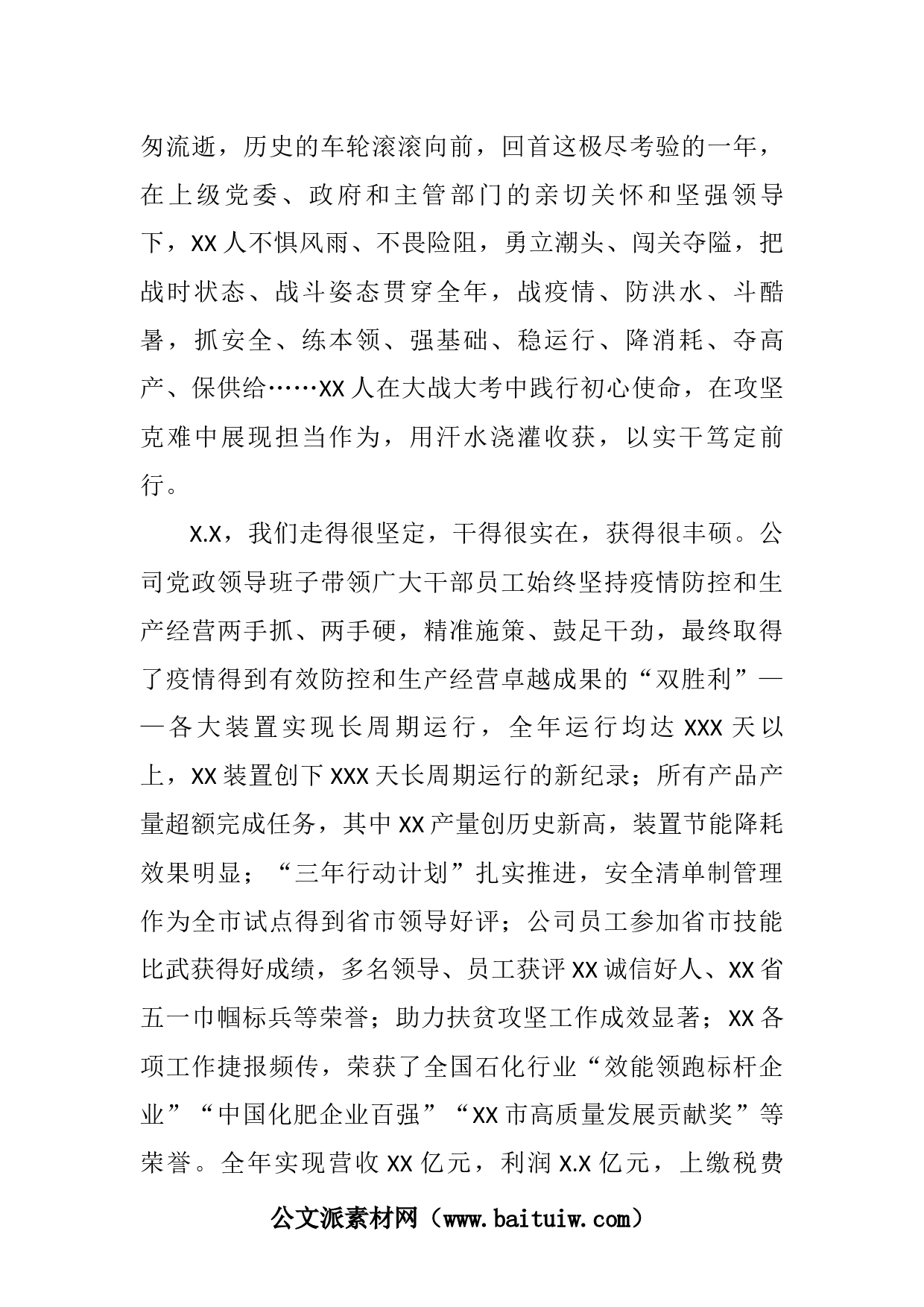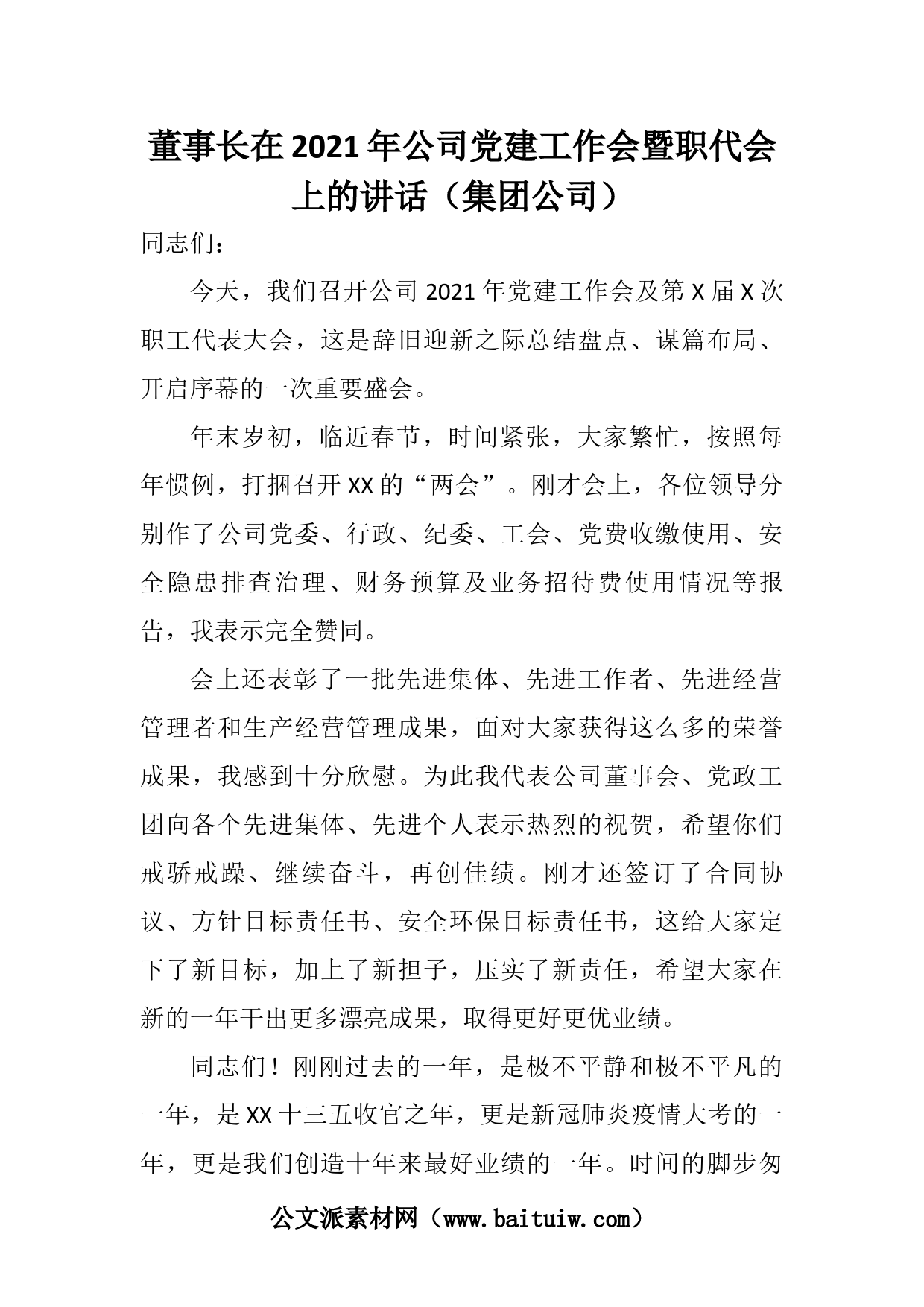 董事長(zhǎng)在2021年公司黨建工作會(huì)暨職代會(huì)上的講話(集團(tuán)公司)同志們:今天,我們召開公司2021年黨建工作會(huì)及第X屆X次職工代表大會(huì),這是辭舊迎新之際總結(jié)盤點(diǎn)、謀篇布局、開啟序幕的一次重要盛會(huì)。年末歲初,臨近春節(jié),時(shí)間緊張,大家繁忙,按照每年慣例,打捆召開XX的“兩會(huì)”。剛才會(huì)上,各位領(lǐng)導(dǎo)分別作了公司黨委、行政、紀(jì)委、工會(huì)、黨費(fèi)收繳使用、安全隱患排查治理、財(cái)務(wù)預(yù)算及業(yè)務(wù)招待費(fèi)使用情況等報(bào)告,我表示完全贊同。會(huì)上還表彰了一批先進(jìn)集體、先進(jìn)工作者、先進(jìn)經(jīng)營(yíng)管理者和生產(chǎn)經(jīng)營(yíng)管理成果,面對(duì)大家獲得這么多的榮譽(yù)成果,我感到十分欣慰。為此我代表公司董...