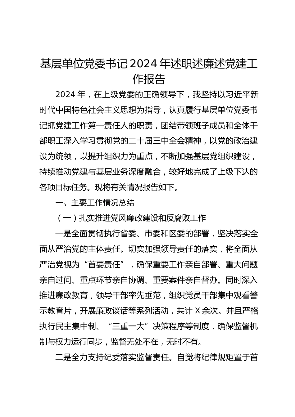 基層單位黨委書(shū)記2024年述職述廉述黨建工作報(bào)告2024年,在上級(jí)黨委的正確領(lǐng)導(dǎo)下,我堅(jiān)持以習(xí)近平新時(shí)代中國(guó)特色社會(huì)主義思想為指導(dǎo),認(rèn)真履行基層單位黨委書(shū)記抓黨建工作第一責(zé)任人的職責(zé),團(tuán)結(jié)帶領(lǐng)班子成員和全體干部職工深入學(xué)習(xí)貫徹黨的二十屆三中全會(huì)精神,以黨的政治建設(shè)為統(tǒng)領(lǐng),以提升組織力為重點(diǎn),不斷加強(qiáng)基層黨組織建設(shè),持續(xù)推動(dòng)黨建與基層業(yè)務(wù)深度融合,較好地完成了上級(jí)下達(dá)的各項(xiàng)目標(biāo)任務(wù)。現(xiàn)將有關(guān)情況報(bào)告如下。一、主要工作情況總結(jié)(一)扎實(shí)推進(jìn)黨風(fēng)廉政建設(shè)和反腐敗工作一是全面貫徹執(zhí)行省委、市委和區(qū)委的部署,堅(jiān)決落實(shí)全面從嚴(yán)治黨的主體責(zé)任。切...