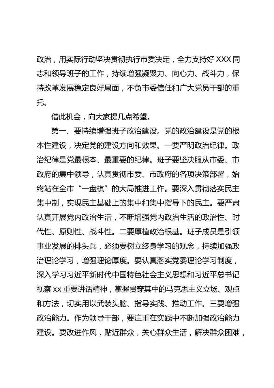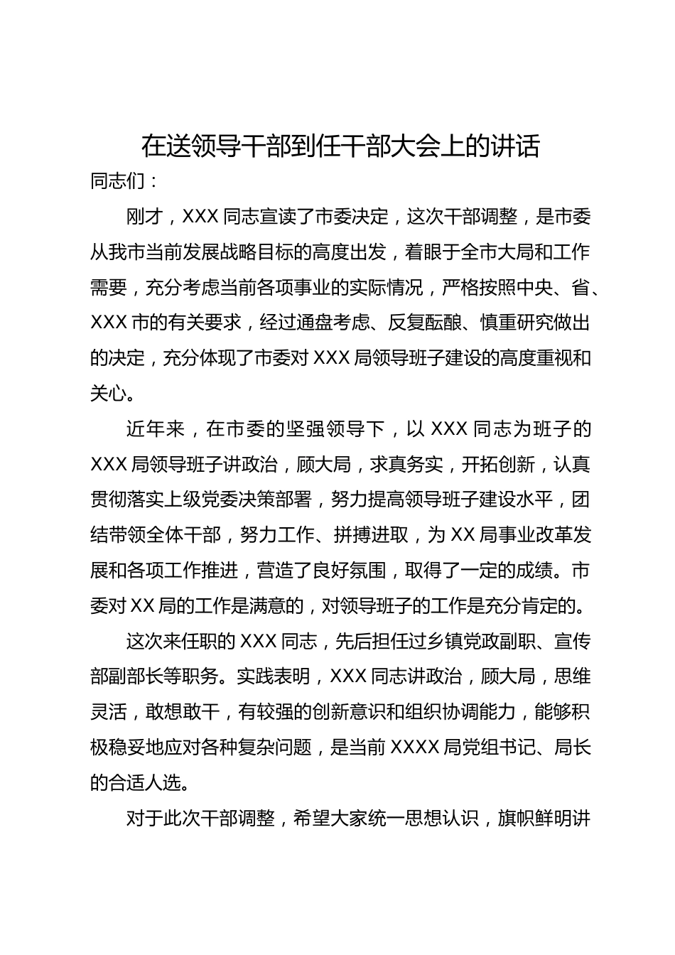 在送領(lǐng)導(dǎo)干部到任干部大會(huì)上的講話同志們:剛才,XXX同志宣讀了市委決定,這次干部調(diào)整,是市委從我市當(dāng)前發(fā)展戰(zhàn)略目標(biāo)的高度出發(fā),著眼于全市大局和工作需要,充分考慮當(dāng)前各項(xiàng)事業(yè)的實(shí)際情況,嚴(yán)格按照中央、省、XXX市的有關(guān)要求,經(jīng)過(guò)通盤考慮、反復(fù)醞釀、慎重研究做出的決定,充分體現(xiàn)了市委對(duì)XXX局領(lǐng)導(dǎo)班子建設(shè)的高度重視和關(guān)心。近年來(lái),在市委的堅(jiān)強(qiáng)領(lǐng)導(dǎo)下,以XXX同志為班子的XXX局領(lǐng)導(dǎo)班子講政治,顧大局,求真務(wù)實(shí),開(kāi)拓創(chuàng)新,認(rèn)真貫徹落實(shí)上級(jí)黨委決策部署,努力提高領(lǐng)導(dǎo)班子建設(shè)水平,團(tuán)結(jié)帶領(lǐng)全體干部,努力工作、拼搏進(jìn)取,為XX局事業(yè)改革發(fā)展和各項(xiàng)工作推...