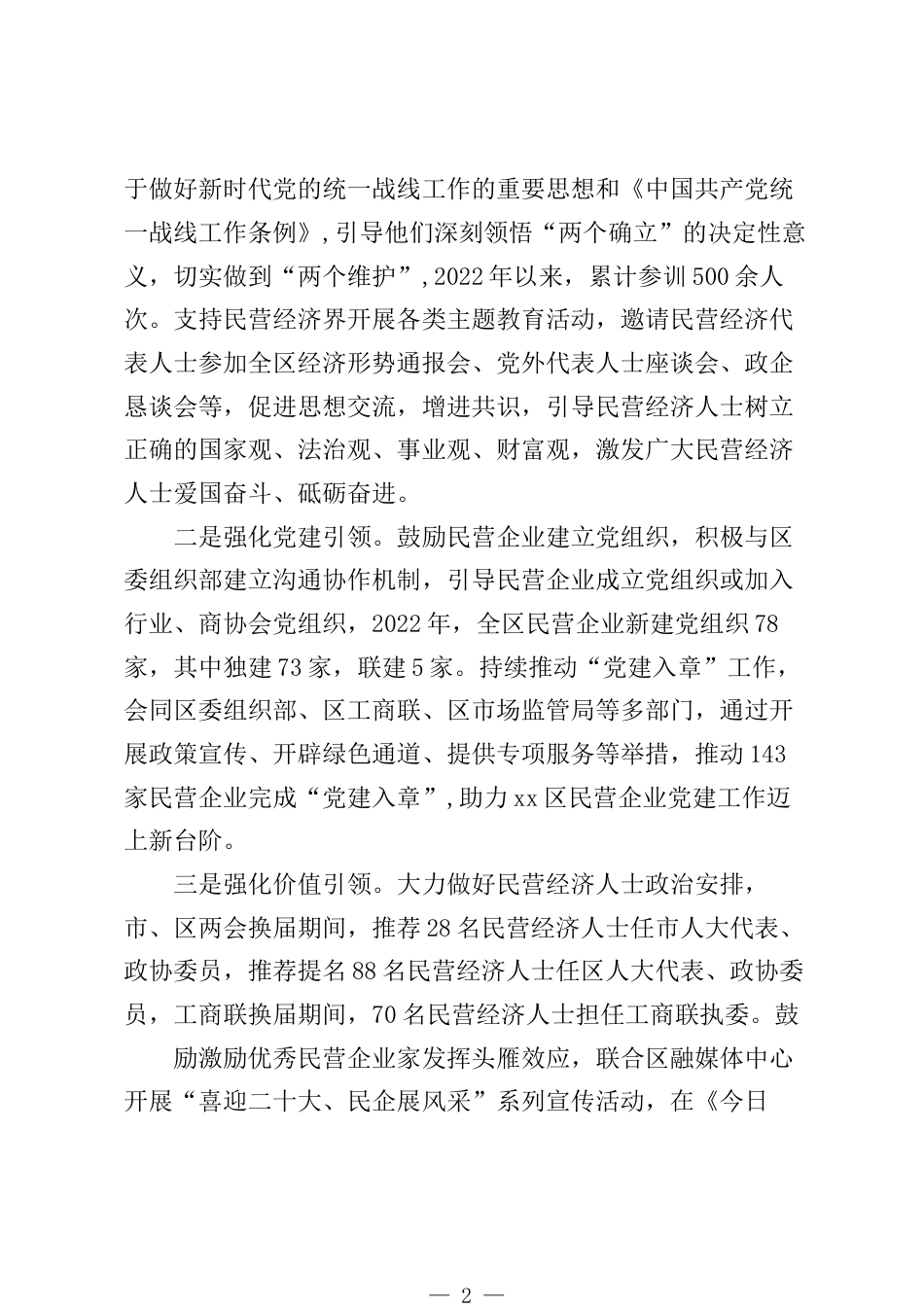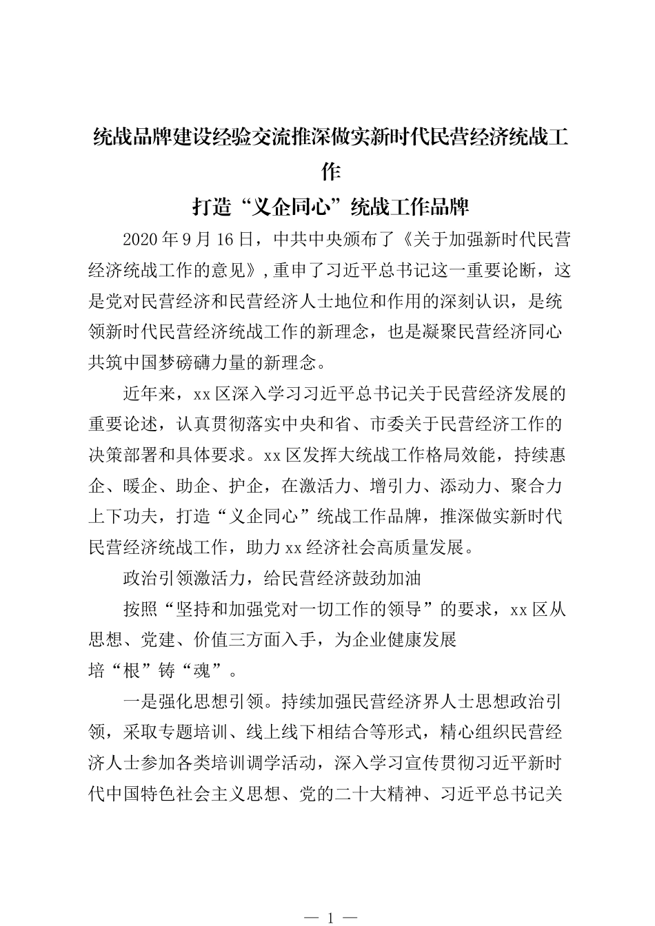 統(tǒng)戰(zhàn)品牌建設(shè)經(jīng)驗交流推深做實新時代民營經(jīng)濟統(tǒng)戰(zhàn)工作打造“義企同心”統(tǒng)戰(zhàn)工作品牌2020年9月16日,中共中央頒布了《關(guān)于加強新時代民營經(jīng)濟統(tǒng)戰(zhàn)工作的意見》,重申了習近平總書記這一重要論斷,這是黨對民營經(jīng)濟和民營經(jīng)濟人士地位和作用的深刻認識,是統(tǒng)領(lǐng)新時代民營經(jīng)濟統(tǒng)戰(zhàn)工作的新理念,也是凝聚民營經(jīng)濟同心共筑中國夢磅礴力量的新理念。近年來,xx區(qū)深入學習習近平總書記關(guān)于民營經(jīng)濟發(fā)展的重要論述,認真貫徹落實中央和省、市委關(guān)于民營經(jīng)濟工作的決策部署和具體要求。xx區(qū)發(fā)揮大統(tǒng)戰(zhàn)工作格局效能,持續(xù)惠企、暖企、助企、護企,在激活力、增引力、添動力、聚合力...