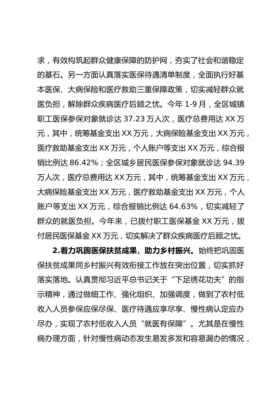 區(qū)醫(yī)療保障局2024年工作總結(jié)和2025年工作計劃今年來,在區(qū)委區(qū)政府的正確領(lǐng)導和上級醫(yī)保部門的精心指導下,我局認真貫徹習近平新時代中國特色社會主義思想,全面落實習總書記關(guān)于醫(yī)療保障工作的重要指示批示精神,堅持以人民健康為中心,以保障群眾醫(yī)保權(quán)益為根本,以增進群眾醫(yī)保獲得感為目的,扎實工作、銳意進取,積極做好各項工作。現(xiàn)將相關(guān)工作情況報告如下:一、2024年工作總結(jié)1.著力推進醫(yī)保體系建設(shè),解除群眾疾病醫(yī)療后顧之憂。堅決按照習總書記關(guān)于“我們建立全民醫(yī)保制度的根本目的,就是要解除全體人民的疾病醫(yī)療后顧之憂”的指示要求,將推進醫(yī)保體系建設(shè)放...