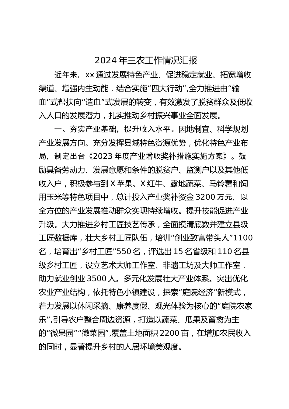 2024年三農(nóng)工作情況匯報近年來,xx通過發(fā)展特色產(chǎn)業(yè)、促進(jìn)穩(wěn)定就業(yè)、拓寬增收“”渠道、增強(qiáng)內(nèi)生動能,結(jié)合實施四大行動,“全力推進(jìn)由輸”“”血式幫扶向造血式發(fā)展的轉(zhuǎn)變,有效激發(fā)了脫貧群眾及低收入人口的發(fā)展?jié)摿?,扎實推動鄉(xiāng)村振興事業(yè)全面發(fā)展。一、夯實產(chǎn)業(yè)基礎(chǔ),提升收入水平。因地制宜、科學(xué)規(guī)劃產(chǎn)業(yè)發(fā)展方向。充分發(fā)揮縣域特色資源優(yōu)勢,優(yōu)化特色產(chǎn)業(yè)布局,制定出臺《2023年度增收措施施方案》。鼓產(chǎn)業(yè)獎補(bǔ)實勵具備勞動力、發(fā)展意愿和條件的脫貧戶、監(jiān)測戶以及其他低收入戶,積極參與到X蘋果、X紅牛、露地蔬菜、馬鈴薯和飼用玉米等特色項目中,總計投入產(chǎn)業(yè)獎...