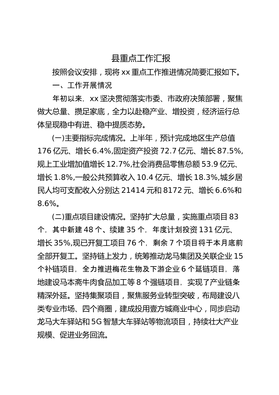縣重點(diǎn)工作匯報(bào)按照會議安排,現(xiàn)將xx重點(diǎn)工作推進(jìn)情況簡要匯報(bào)如下。一、工作開展情況年初以來,xx堅(jiān)決貫徹落實(shí)市委、市政府決策部署,聚焦做大總量、攢足家底,全力以赴穩(wěn)產(chǎn)業(yè)、增投資,經(jīng)濟(jì)運(yùn)行總體呈現(xiàn)穩(wěn)中有進(jìn)、穩(wěn)中提質(zhì)態(tài)勢。(一)主要指標(biāo)完成情況。上半年,預(yù)計(jì)完成地區(qū)生產(chǎn)總值176億元、增長6.4%,固定資產(chǎn)投資72.7億元、增長87.5%,規(guī)上工業(yè)增加值增長12.7%,社會消費(fèi)品零售總額53.9億元、增長1.8%,一般公共預(yù)算收入10.4億元、增長18.3%,城鄉(xiāng)居民人均可支配收入分別達(dá)21414元和8172元、增長6.6%和8.6%。(二)重點(diǎn)項(xiàng)目建設(shè)情況。堅(jiān)持?jǐn)U大總量,實(shí)施重點(diǎn)項(xiàng)目83個,其中...