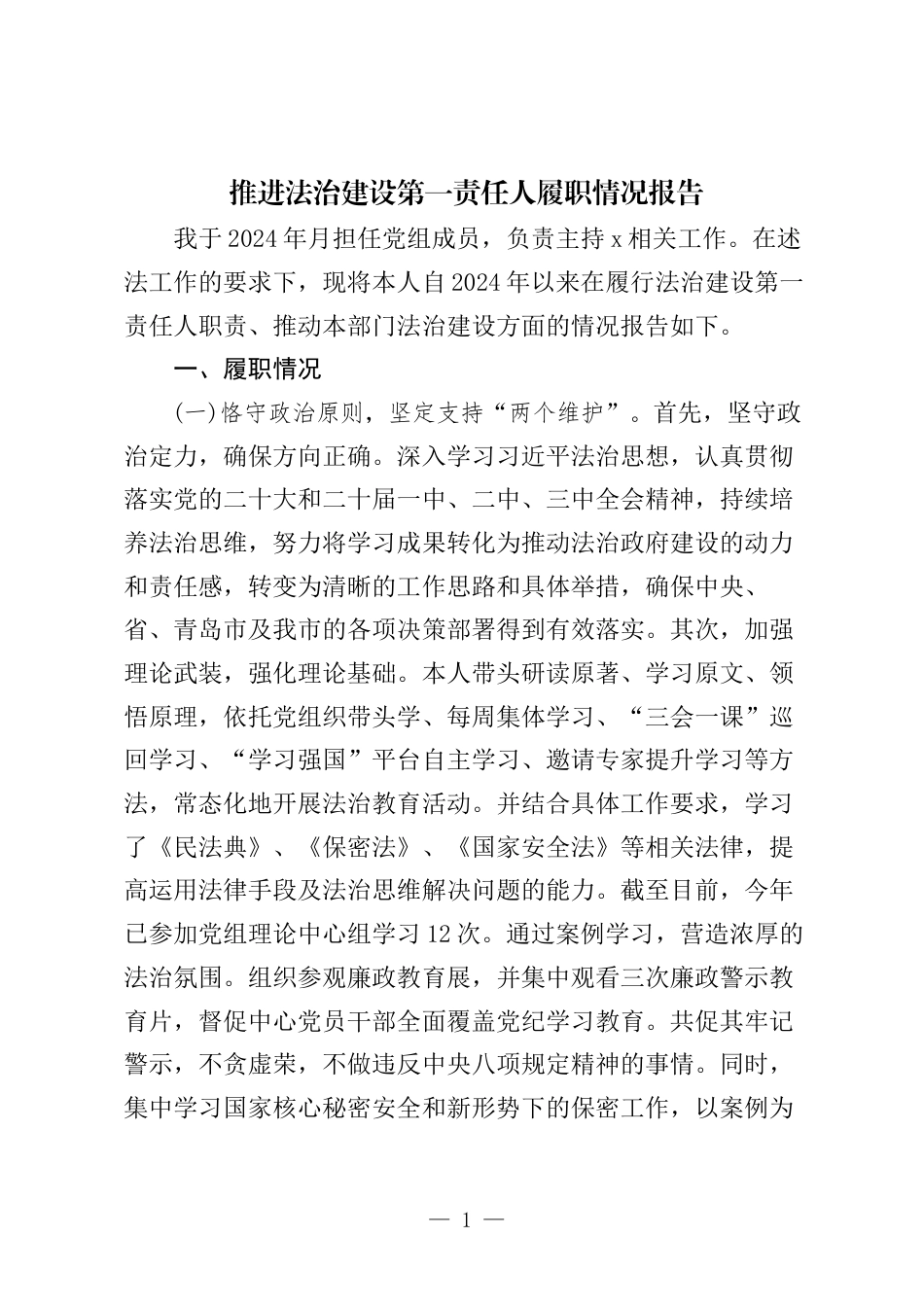 推進(jìn)法治建設(shè)第一責(zé)任人履職情況報(bào)告我于2024年月?lián)吸h組成員,負(fù)責(zé)主持x相關(guān)工作。在述法工作的要求下,現(xiàn)將本人自2024年以來在履行法治建設(shè)第一責(zé)任人職責(zé)、推動(dòng)本部門法治建設(shè)方面的情況報(bào)告如下。一、履職情況(一)恪守政治原則,堅(jiān)定支持“兩個(gè)維護(hù)”。首先,堅(jiān)守政治定力,確保方向正確。深入學(xué)習(xí)習(xí)近平法治思想,認(rèn)真貫徹落實(shí)黨的二十大和二十屆一中、二中、三中全會(huì)精神,持續(xù)培養(yǎng)法治思維,努力將學(xué)習(xí)成果轉(zhuǎn)化為推動(dòng)法治政府建設(shè)的動(dòng)力和責(zé)任感,轉(zhuǎn)變?yōu)榍逦墓ぷ魉悸泛途唧w舉措,確保中央、省、青島市及我市的各項(xiàng)決策部署得到有效落實(shí)。其次,加強(qiáng)理論武裝,...