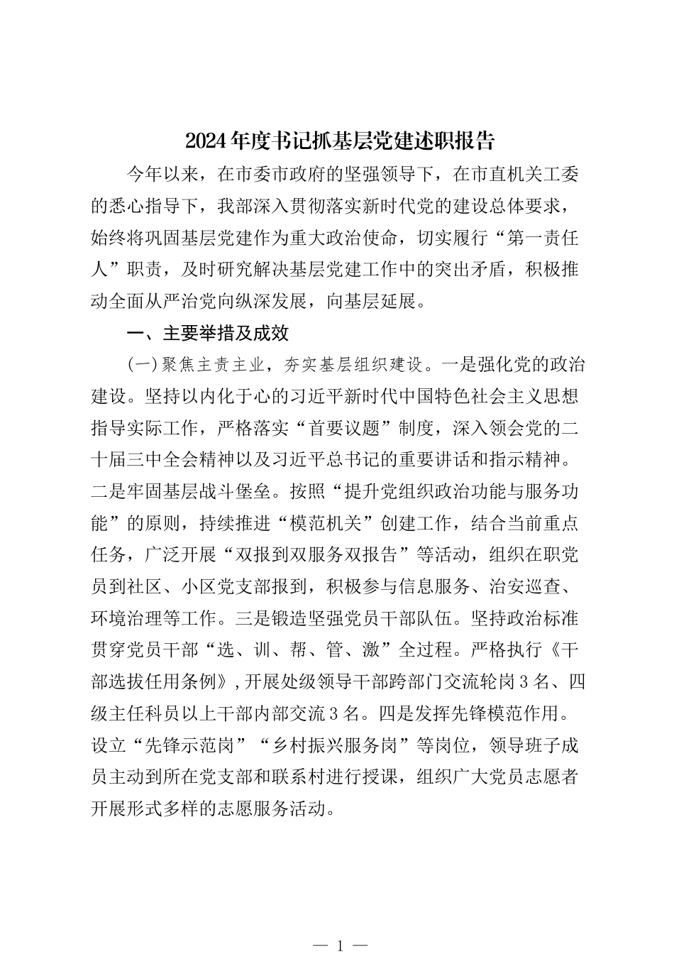2024年度書記抓基層黨建述職報(bào)告今年以來,在市委市政府的堅(jiān)強(qiáng)領(lǐng)導(dǎo)下,在市直機(jī)關(guān)工委的悉心指導(dǎo)下,我部深入貫徹落實(shí)新時(shí)代黨的建設(shè)總體要求,始終將鞏固基層黨建作為重大政治使命,切實(shí)履行“第一責(zé)任人”職責(zé),及時(shí)研究解決基層黨建工作中的突出矛盾,積極推動(dòng)全面從嚴(yán)治黨向縱深發(fā)展,向基層延展。一、主要舉措及成效(一)聚焦主責(zé)主業(yè),夯實(shí)基層組織建設(shè)。一是強(qiáng)化黨的政治建設(shè)。堅(jiān)持以內(nèi)化于心的習(xí)近平新時(shí)代中國特色社會主義思想指導(dǎo)實(shí)際工作,嚴(yán)格落實(shí)“首要議題”制度,深入領(lǐng)會黨的二十屆三中全會精神以及習(xí)近平總書記的重要講話和指示精神。二是牢固基層戰(zhàn)斗堡...