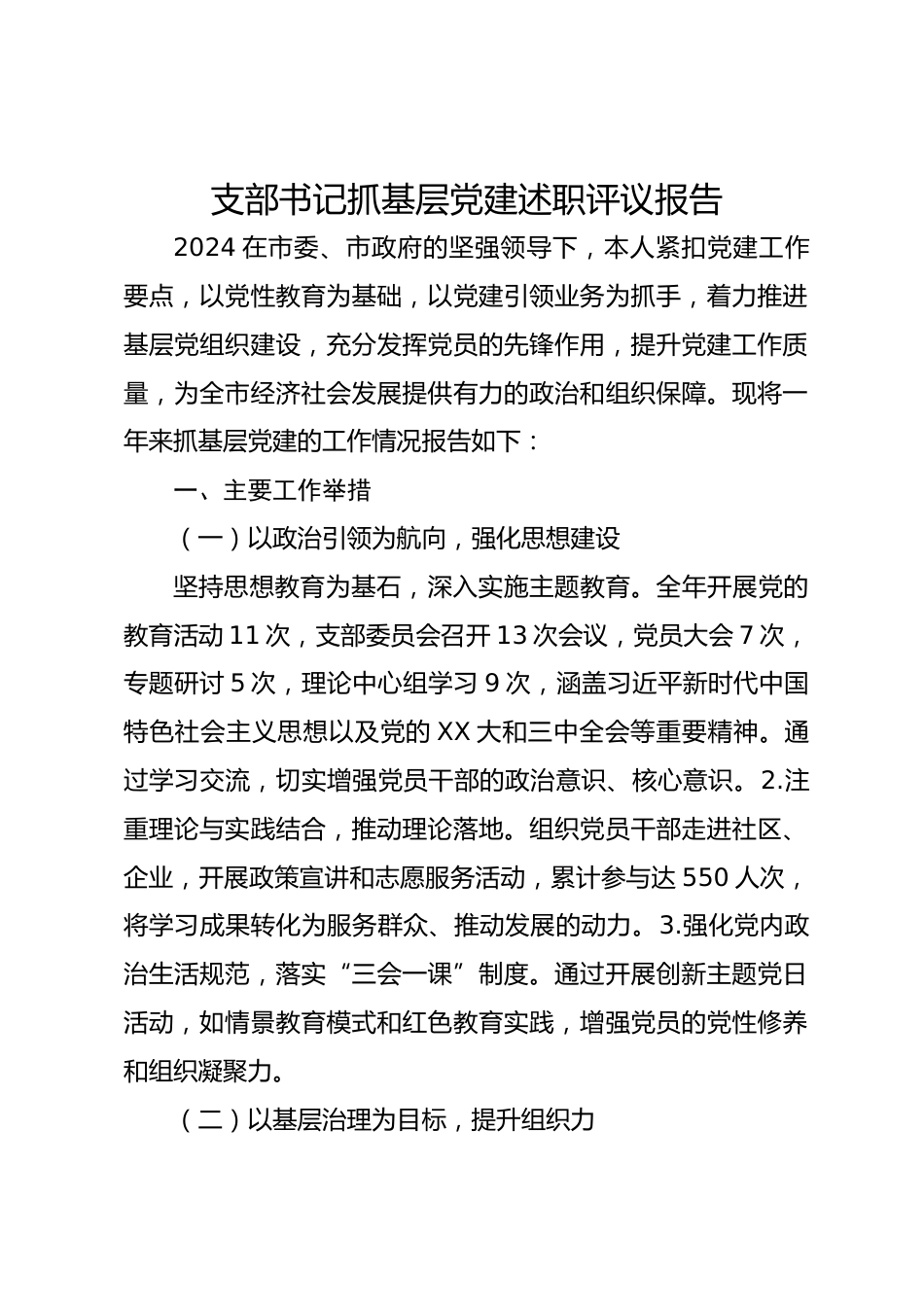 支部書記抓基層黨建述職評議報告2024在市委、市政府的堅強領導下,本人緊扣黨建工作要點,以黨性教育為基礎,以黨建引領業(yè)務為抓手,著力推進基層黨組織建設,充分發(fā)揮黨員的先鋒作用,提升黨建工作質(zhì)量,為全市經(jīng)濟社會發(fā)展提供有力的政治和組織保障?,F(xiàn)將一年來抓基層黨建的工作情況報告如下:一、主要工作舉措(一)以政治引領為航向,強化思想建設堅持思想教育為基石,深入實施主題教育。全年開展黨的教育活動11次,支部委員會召開13次會議,黨員大會7次,專題研討5次,理論中心組學習9次,涵蓋習近平新時代中國特色社會主義思想以及黨的XX大和三中全會等重要精神。...