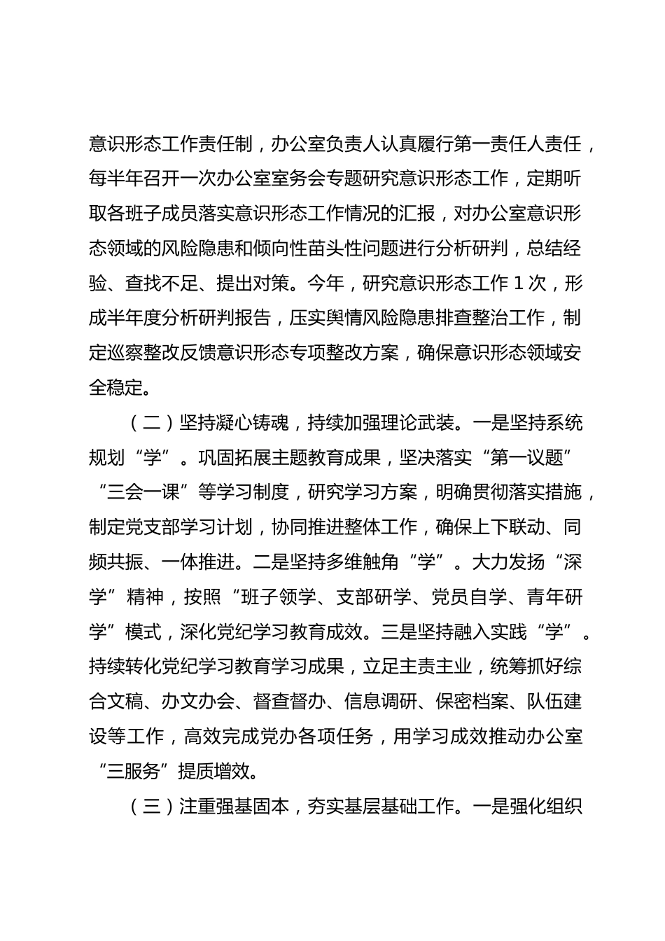 市委辦公室主任2024年述職述廉述報告2024年,我始終堅持以習(xí)近平新時代中國特色社會主義思想為指導(dǎo),團(tuán)結(jié)帶領(lǐng)市委辦公室全體干部職工認(rèn)真落實新時代黨的建設(shè)總要求和新時代黨的組織路線,以黨紀(jì)學(xué)習(xí)教育為主線,全面增強(qiáng)黨組織政治功能和組織功能,充分發(fā)揮黨建在引領(lǐng)業(yè)務(wù)、推動改革發(fā)展中的強(qiáng)大作用,為黨辦事業(yè)高質(zhì)量發(fā)展提供堅強(qiáng)的政治保障。一、主要工作情況(一)突出政治統(tǒng)領(lǐng),強(qiáng)化機(jī)關(guān)政治建設(shè)。一是履行主體責(zé)任。辦公室負(fù)責(zé)人履行第一責(zé)任人責(zé)任,帶頭管陣地、把導(dǎo)向,班子成員按照“一崗雙責(zé)”要求,以更高標(biāo)準(zhǔn)、更實舉措落實黨建工作主體責(zé)任,形成齊抓共管、...