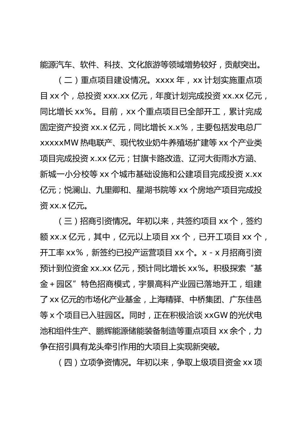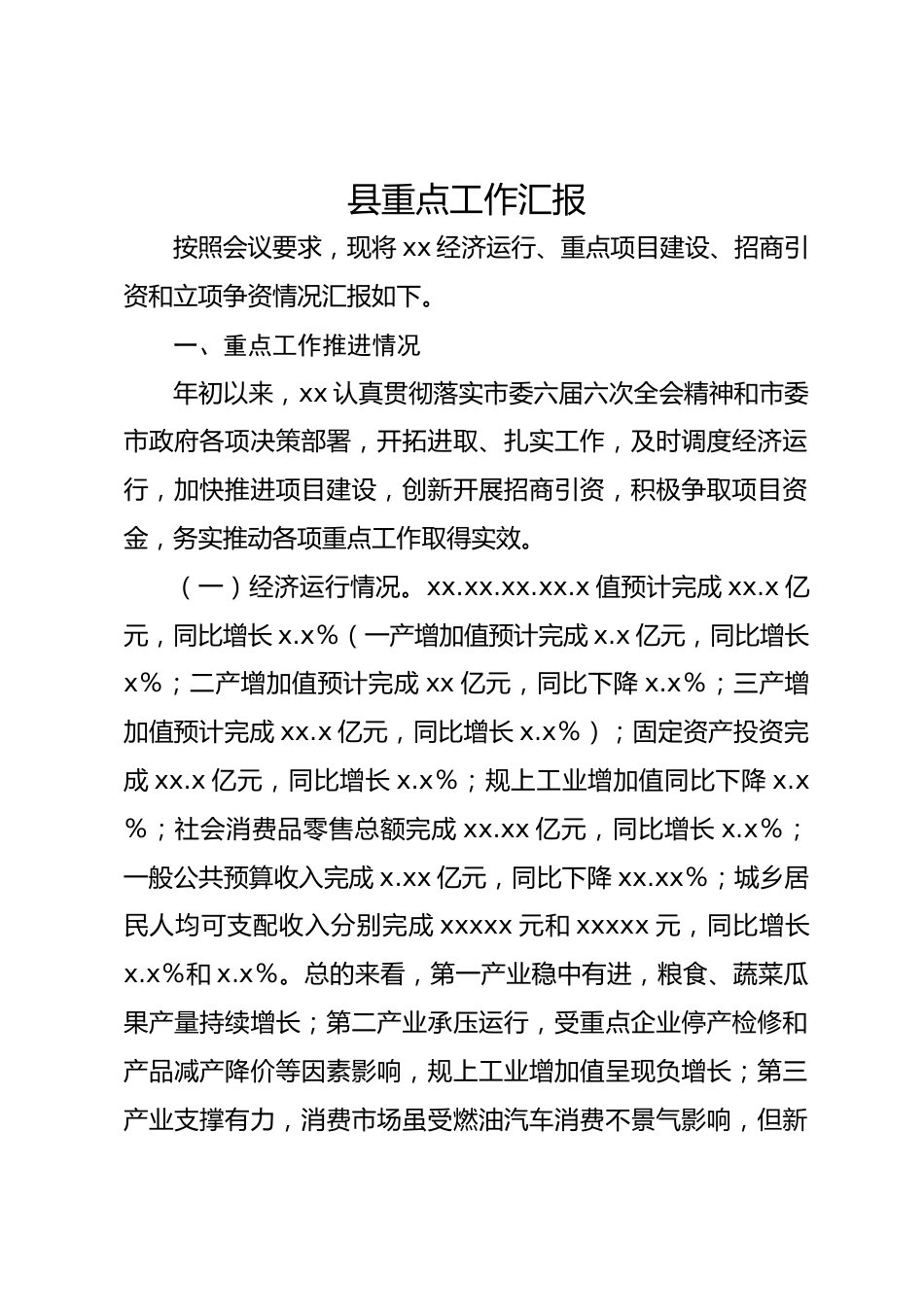 縣重點(diǎn)工作匯報(bào)按照會(huì)議要求,現(xiàn)將xx經(jīng)濟(jì)運(yùn)行、重點(diǎn)項(xiàng)目建設(shè)、招商引資和立項(xiàng)爭(zhēng)資情況匯報(bào)如下。一、重點(diǎn)工作推進(jìn)情況年初以來,xx認(rèn)真貫徹落實(shí)市委六屆六次全會(huì)精神和市委市政府各項(xiàng)決策部署,開拓進(jìn)取、扎實(shí)工作,及時(shí)調(diào)度經(jīng)濟(jì)運(yùn)行,加快推進(jìn)項(xiàng)目建設(shè),創(chuàng)新開展招商引資,積極爭(zhēng)取項(xiàng)目資金,務(wù)實(shí)推動(dòng)各項(xiàng)重點(diǎn)工作取得實(shí)效。(一)經(jīng)濟(jì)運(yùn)行情況。xx.xx.xx.xx.x值預(yù)計(jì)完成xx.x億元,同比增長(zhǎng)x.x%(一產(chǎn)增加值預(yù)計(jì)完成x.x億元,同比增長(zhǎng)x%;二產(chǎn)增加值預(yù)計(jì)完成xx億元,同比下降x.x%;三產(chǎn)增加值預(yù)計(jì)完成xx.x億元,同比增長(zhǎng)x.x%);固定資產(chǎn)投資完成xx.x億元,同比增長(zhǎng)...